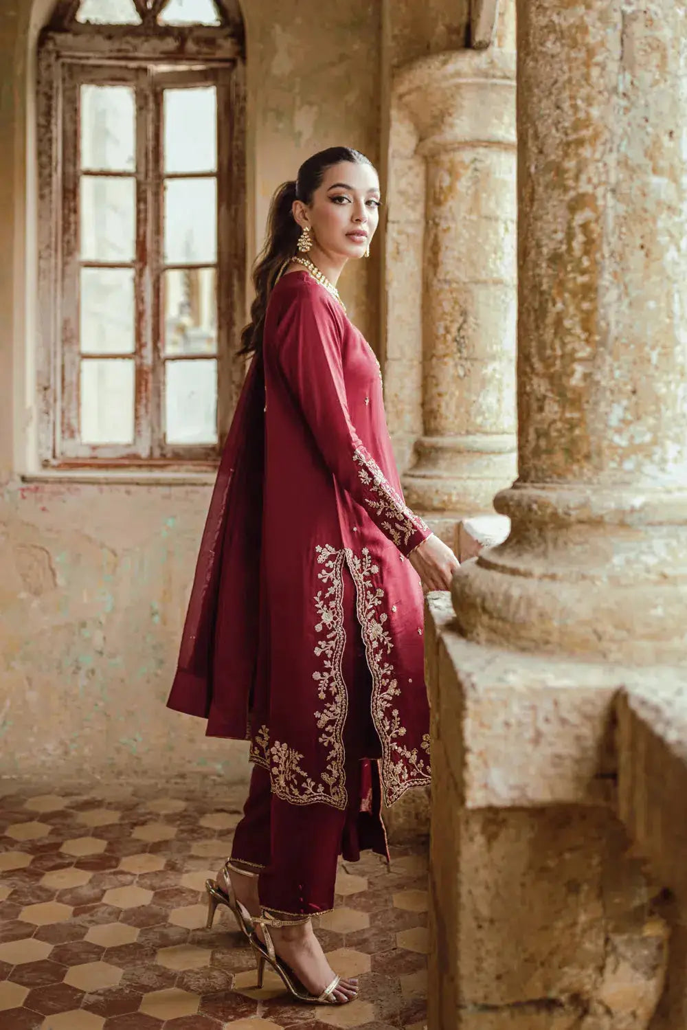 Illustrating "Majestic Rouge," a captivating ensemble in luxurious maroon, expertly crafted on raw silk fabric. The shirt is a canvas of opulence, adorned with golden embroidery all over the shirt that dances gracefully across every inch. Immerse yourself in the beauty of hand-embellished details, featuring kora, dabka, sequins, pearls, and naqshi, adding a touch of artisanal splendor. The straight trousers are elevated with a hoop button hand-embellished hemline, offering a perfect complement to the shirt's allure. To complete this regal ensemble, drape yourself in the intricately embellished dupatta, adorned with a contrast embroidered lace, and a mesmerizing spray of sequins, ensuring that "Majestic Rouge" is not just a dress but a statement of timeless elegance.