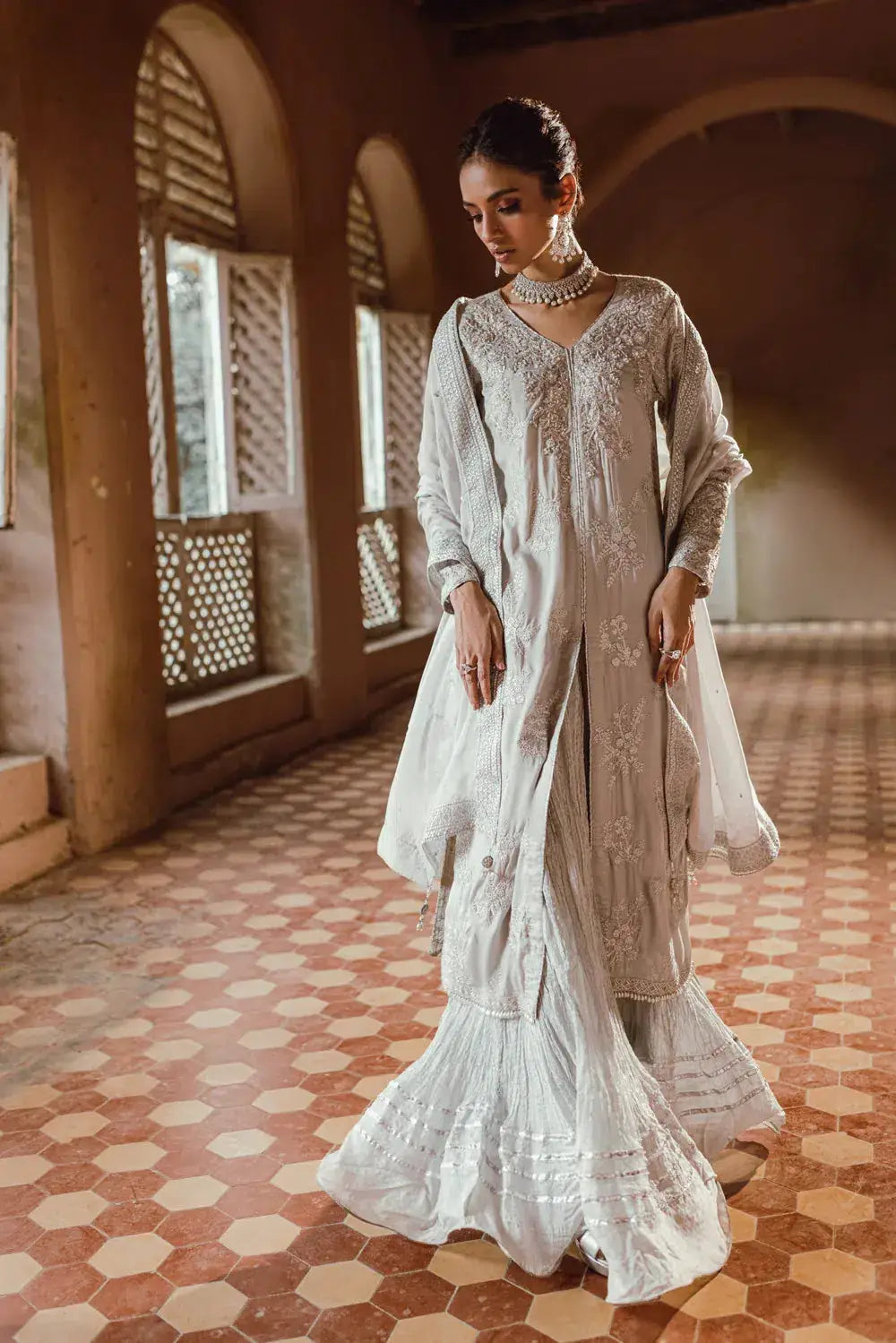 Presenting "Snowfall" a graceful ensemble in a serene grey tone. The fully embroidered straight front-open shirt features intricate hand embellishments on the neck using kora, dabka, sequins, and pearls. Tassel embellishments along the front border add a whimsical touch. Paired with plazo silk crushed pants adorned with gota lace, and a chiffon dupatta featuring lace adornments on all four sides, complete with charming tassels. "Snowfall" promises to envelop you in elegance and timeless style.