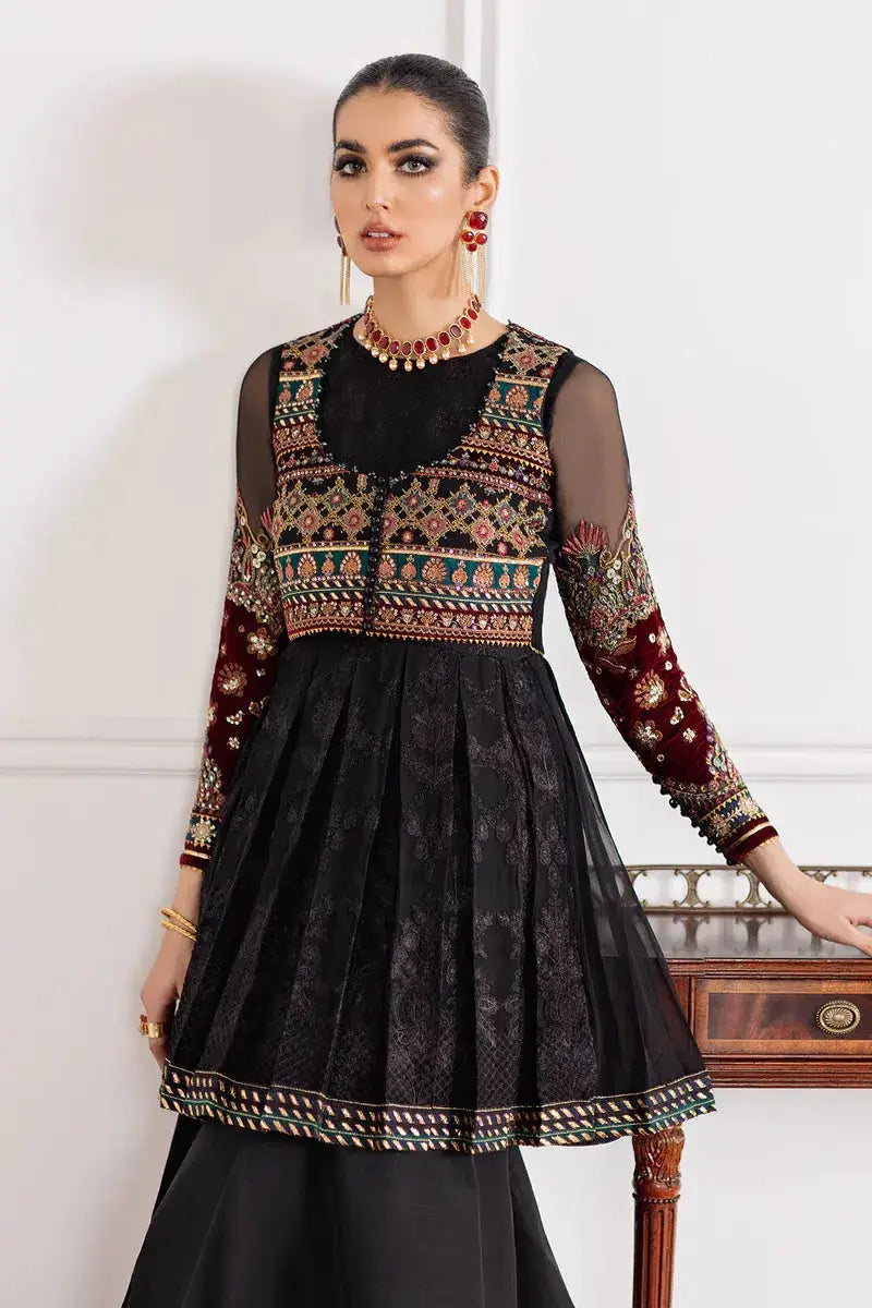 Fabric: Shirt (Embroidered Chiffon & Velvet), Dupatta (Embroidered Organza & Velvet), Trouser (Dyed Silk with Embroidered Patches)
