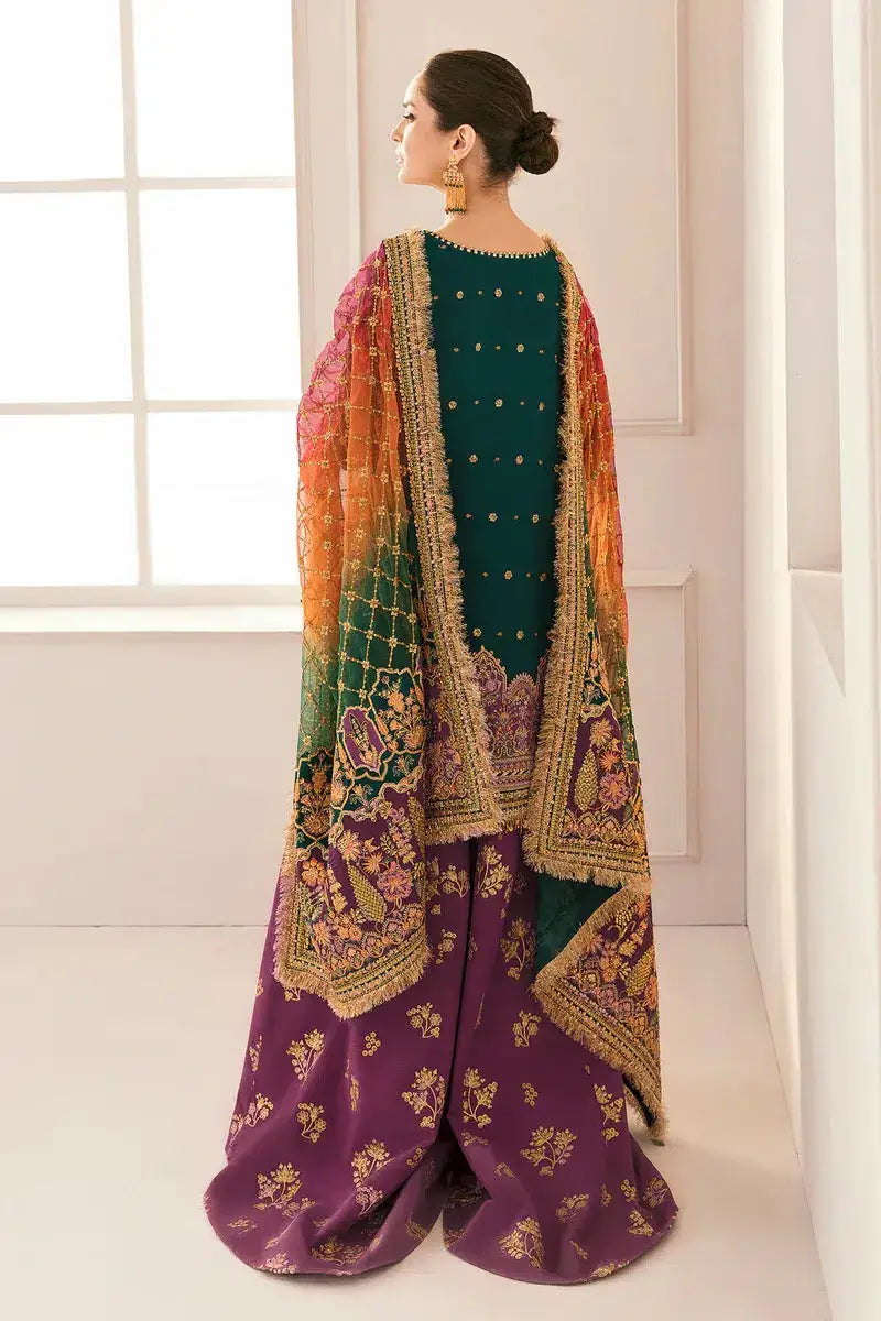 Radiate sophistication with this Baroque formal outfit from the Formals Collection. The ensemble features an embroidered chiffon front and back shirt with detailed grip front-back patches, complemented by chiffon sleeves with grip sleeve patches. The embroidered chiffon dupatta is enhanced with grip patches, and embroidered silk trousers complete this luxurious outfit. Ideal for weddings, mehndi, and festive occasions, it reflects exquisite craftsmanship and timeless elegance.