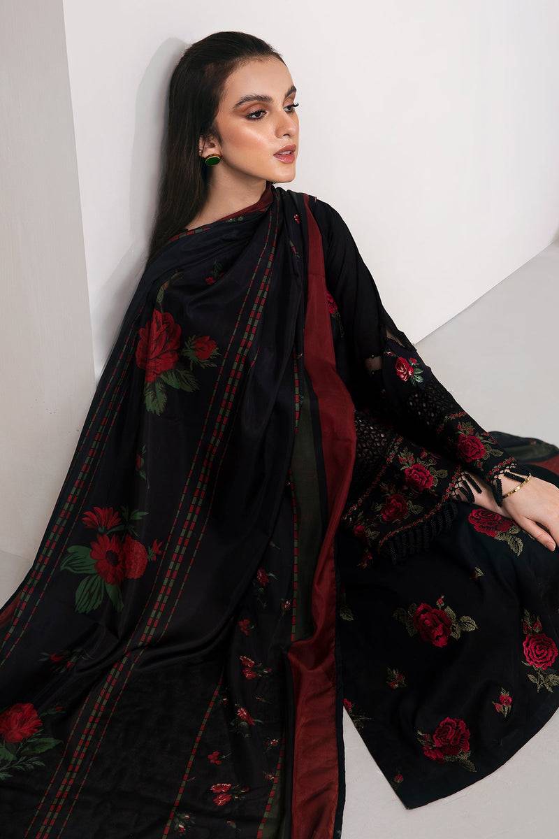 This 3-piece black lawn outfit from Baroque’s Lawn Collection 24, design code UF-361, is a timeless ensemble crafted with understated elegance. It features a plain lawn front and back paired with an embroidered organza sleeves patch and a cotton sleeves patch for detailing. The dyed cotton trouser complements the look, while a digital printed silk dupatta adds a refined finish. Perfect for semi-formal gatherings, festive occasions, and graceful day wear.