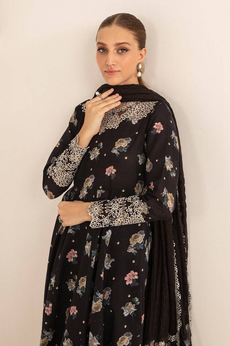 This striking black ensemble is crafted for timeless elegance, featuring a digitally printed lawn front, back, and trouser. The neckline is elevated with an intricately embroidered organza patch, while embroidered sleeve details add a refined touch. A dyed cotton patti dupatta forms the centerpiece, enhanced with a mix of embroidered borders, embroidered patches, and digitally printed silk dupatta patches for a luxurious finish. An outfit designed to exude festive sophistication and modern artistry.