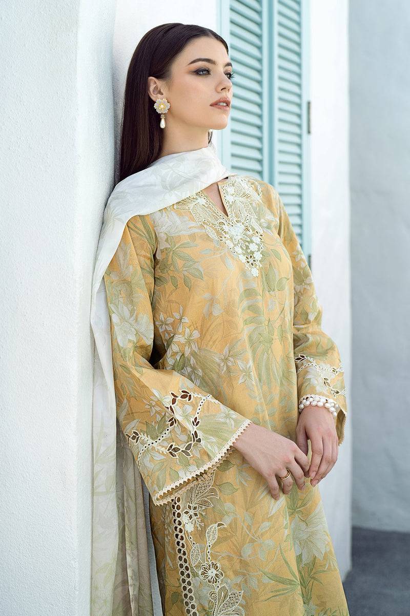 This soft beige digital printed lawn outfit from Baroque’s Lawn Collection 24 combines elegance and charm. The shirt and trouser feature embroidered organza accents including a neckline patch, front borders, side border, and sleeve borders. A coordinating digital printed silk dupatta completes the ensemble, making it perfect for semi-formal events, festive gatherings, or daytime occasions.