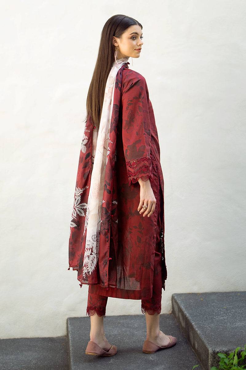 This maroon digital printed lawn outfit from Baroque’s Lawn Collection 24 offers a striking balance of contemporary prints and refined embroidery. The shirt and trouser are enhanced with an embroidered organza neckline patch, sleeve borders, and a front side border, providing subtle sophistication. A flowing digital printed silk dupatta and an embroidered organza trouser detail complete the look, perfect for festive occasions and semi-formal gatherings.
