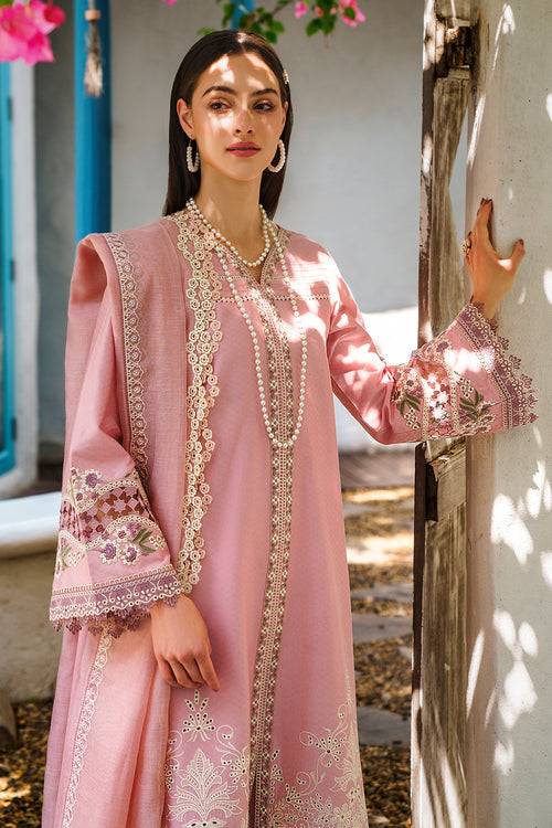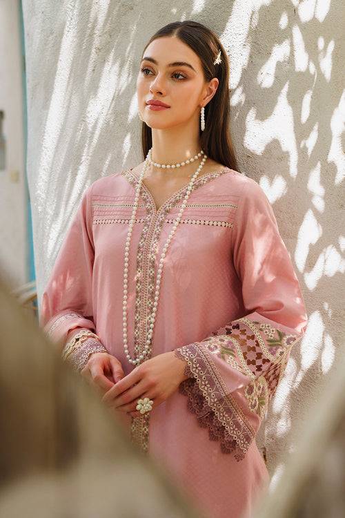 Step into refined elegance with this pink jacquard lawn outfit from Baroque’s Luxury Pret 24 collection. The embroidered self-jacquard front is beautifully complemented by plain jacquard back and sleeves, while organza borders on the front, back, sleeves, and trousers add rich detail. The look is completed with a dyed cotton net dupatta, luxuriously framed with 15 yards of embroidered organza borders, and a dyed cotton trouser with a matching border. This ensemble blends luxury craftsmanship with timeless grace—ideal for festive and semi-formal occasions.