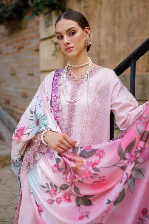 This Luxury Jacquard 24 ensemble in a graceful pink shade combines classic texture with contemporary embellishment. The self-jacquard lawn shirt is beautifully elevated with embroidered organza borders and a neckline patch, complemented by a digital printed silk dupatta that adds vibrancy. A dyed cotton trouser balances the look, while the digitally printed silk patch for the front and sleeves lends an extra refined touch. Perfect for festive and semi-formal occasions.