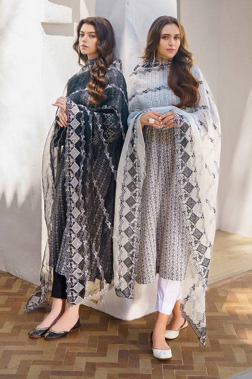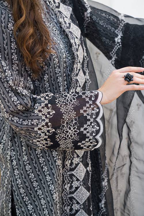 This refined black lawn ensemble from Lawn 24 blends digital artistry with elegant embroidery. The digital printed lawn shirt is paired with a dyed cotton trouser for a sleek silhouette, while the embroidered organza dupatta and borders elevate the look with timeless sophistication. A graceful choice for festive gatherings and evening occasions.