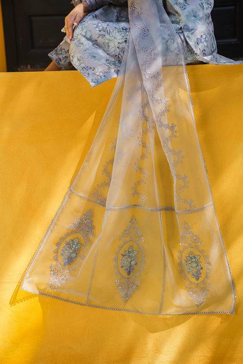 An elegant Ice Blue ensemble from the Luxury Pret 24 collection, crafted from premium digital printed lawn with embroidered details for refined sophistication. The embroidered digital printed shirt and sleeves pair seamlessly with a printed back and trouser. The look is elevated by an embroidered organza neckline and sleeves border, while the embroidered organza dupatta with a delicately worked border completes this graceful semi-formal attire.