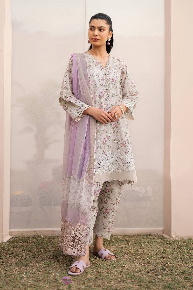 This Luxury Lawn 24 ensemble in pastel gray strikes a perfect balance of modern digital print and delicate embroidery. The shirt features an embroidered digital printed lawn front with matching embroidered sleeves, paired with a digital printed back and trouser. A chiffon dupatta with embroidered organza border adds graceful charm, completing the semi-formal look.
