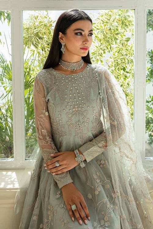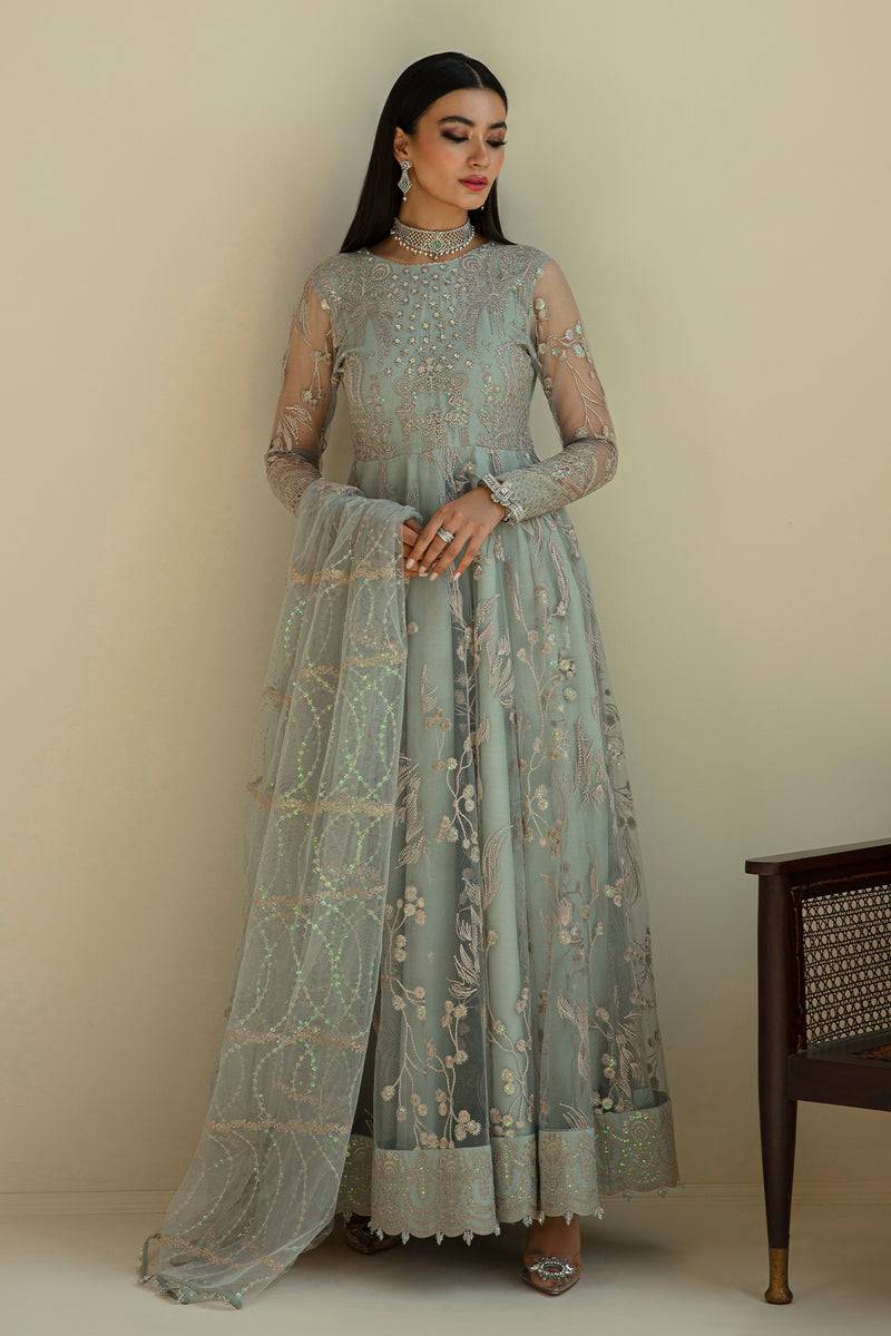 Elevate your festive style with this sage green net outfit from Baroque’s Luxury Pret 24 collection. The ensemble features a delicately embroidered net front body with matching front and sleeves, paired with a dyed net back for balance. Rich embroidered silk borders add depth and luxury, while the embroidered net dupatta completes the look with refined elegance. Finished with a dyed silk trouser, this design is perfect for semi-formal occasions and festive gatherings.