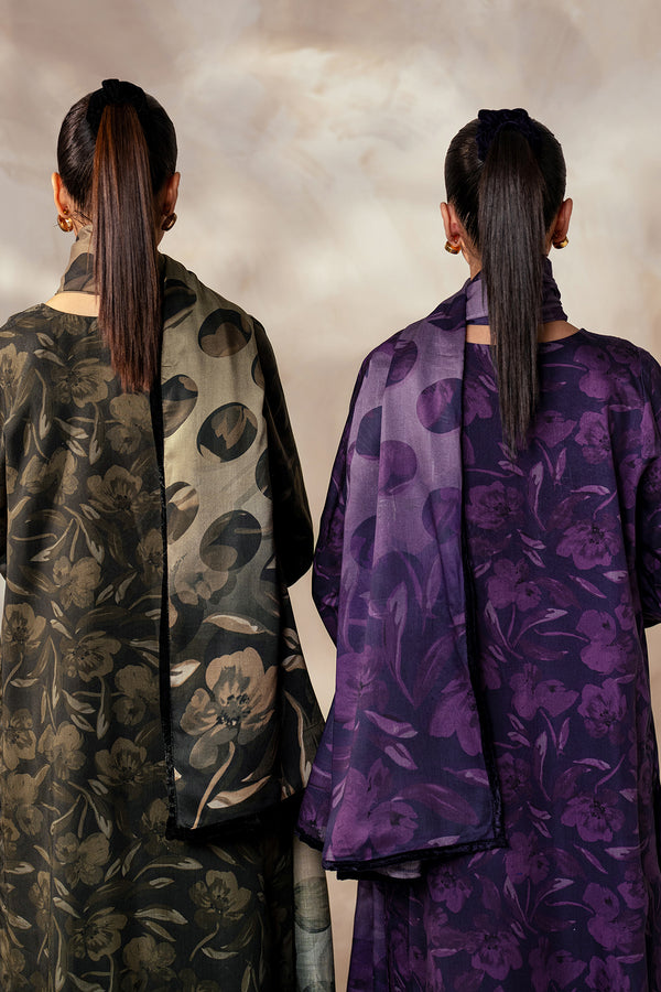 This elegant ensemble features a shirt and trousers crafted from slub khaddar, adorned with intricate schiffli embroidery and complemented by digital print detailing. The digital printed twill shawl adds a stylish finishing touch, bringing together sophistication and comfort for formal occasions.