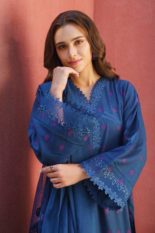 This Dark Blue Jacquard Lawn ensemble from the Luxury Pret 24 collection is a timeless classic. The jacquard shirt is adorned with an embroidered organza neckline patch and complemented with elegant embroidered borders for the front, back, and sleeves. A dyed cotton net dupatta enhanced with embroidered side borders adds flowy sophistication, while the dyed cotton trouser with an embroidered border completes this graceful and regal look—ideal for festive and semi-formal wear.