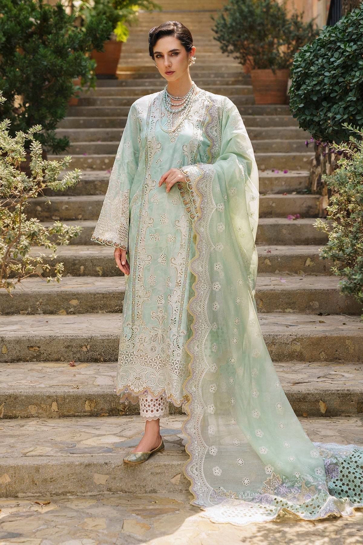 Radiate grace in this refreshing light green ensemble from Baroque’s Swiss Lawn 24 collection. The digitally printed and embroidered lawn front is highlighted with a delicately embroidered organza neckline and panel patches, giving it a regal structure. Paired with a digital printed lawn back and embroidered sleeves enhanced with organza sleeve patches, the design carries a refined charm. The embroidered cotton net dupatta with organza borders adds a lightweight yet luxurious drape, while the dyed cotton trouser, finished with an embroidered organza patch, completes the look. Perfect for festive gatherings and semi-formal events, this design blends tradition with modern elegance.