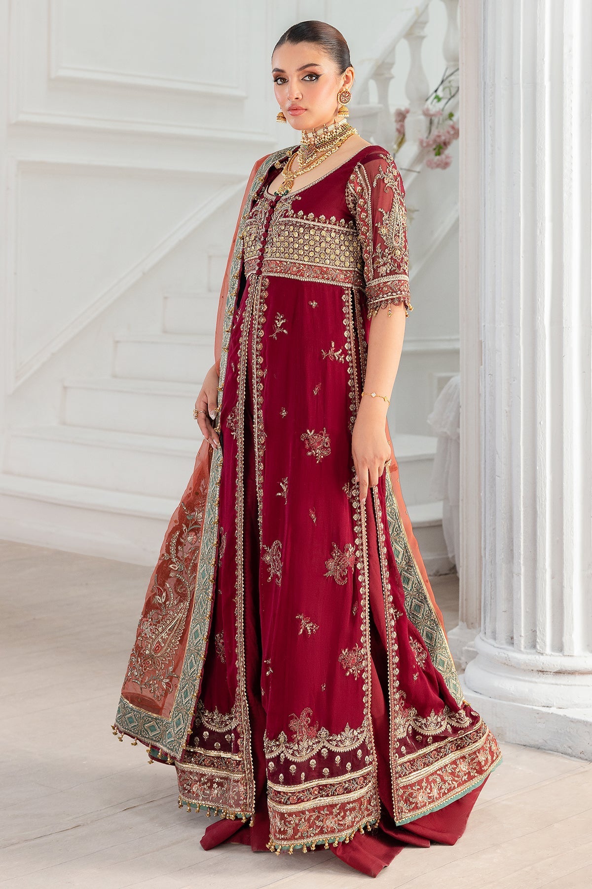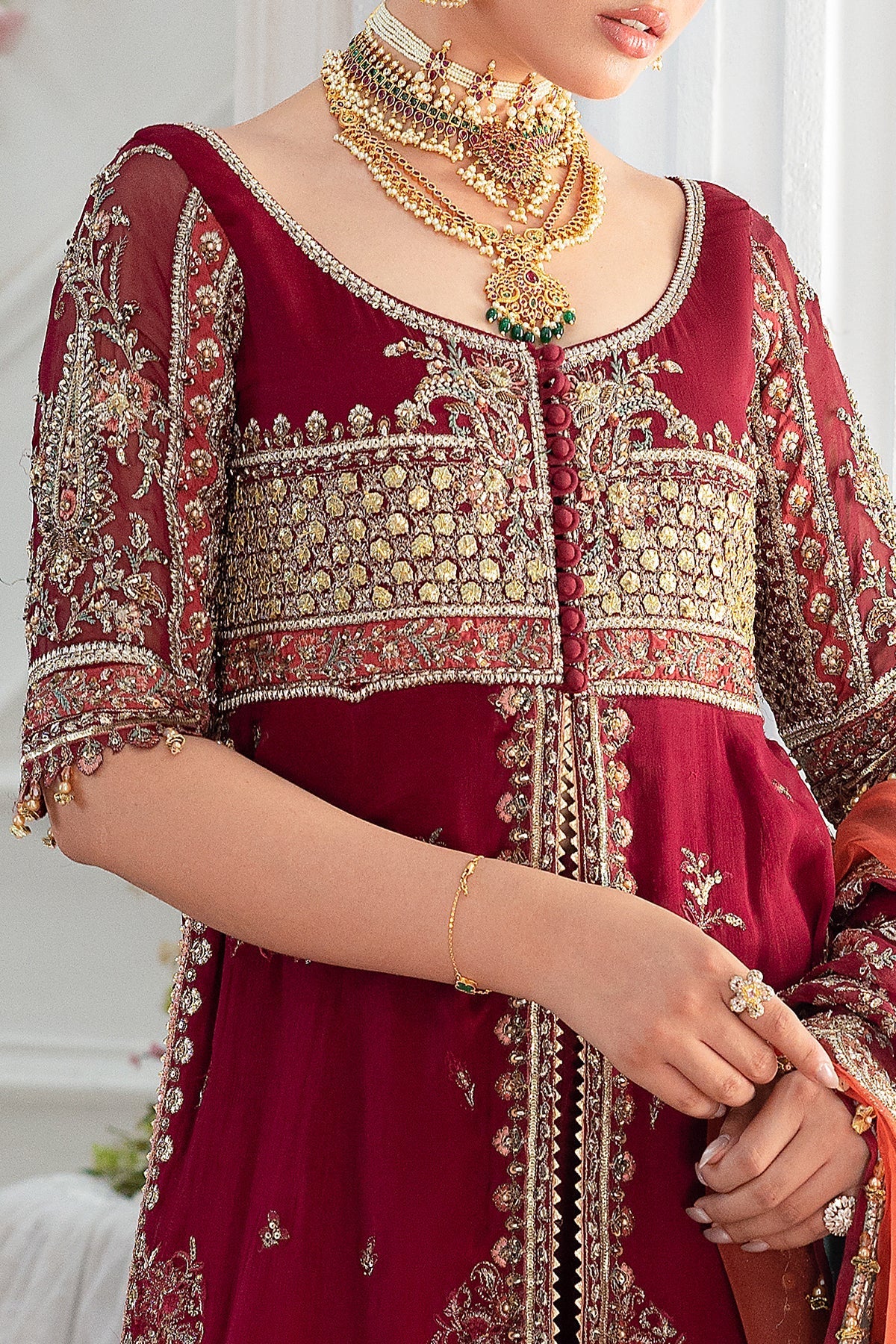 An opulent ensemble featuring an intricately embroidered and adda work dyed chiffon shirt with detailed front and back kali panels, yock, sleeve, and daman embellishments. The set is paired with a dyed inner shirt, a dyed raw silk trouser, and a dyed organza dupatta adorned with extensive embroidered patti and dupatta pallu detailing. This outfit is the epitome of festive luxury, perfect for Eid and special occasions.
