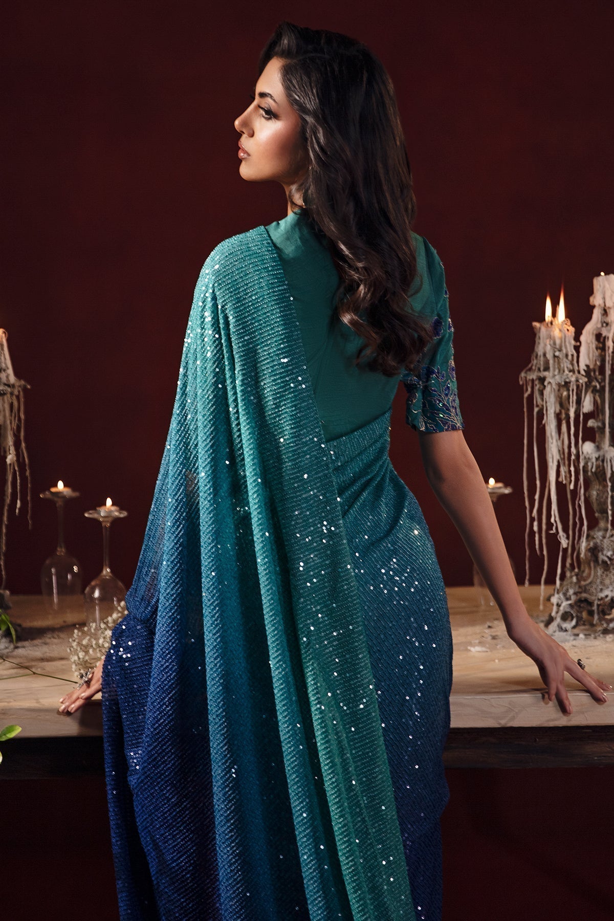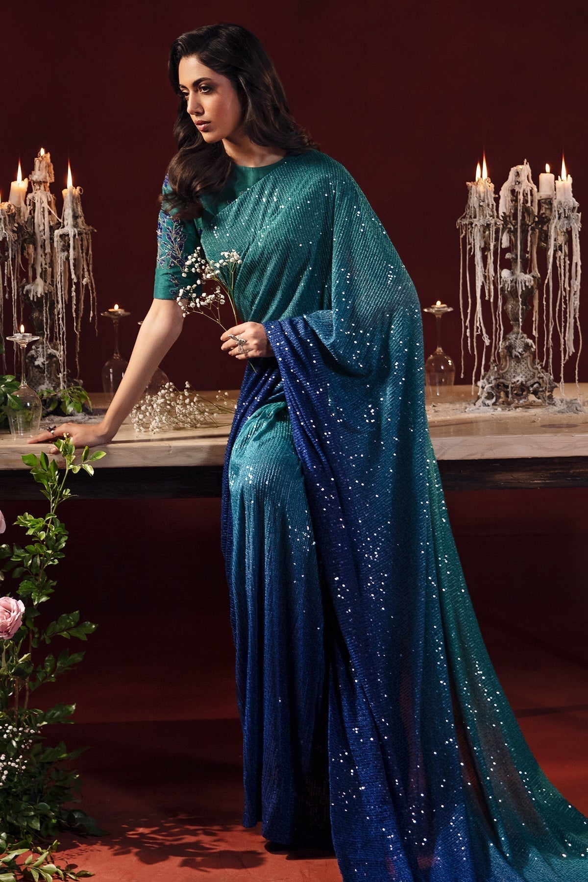 Saree: Embroidered Sequins Net Saree.