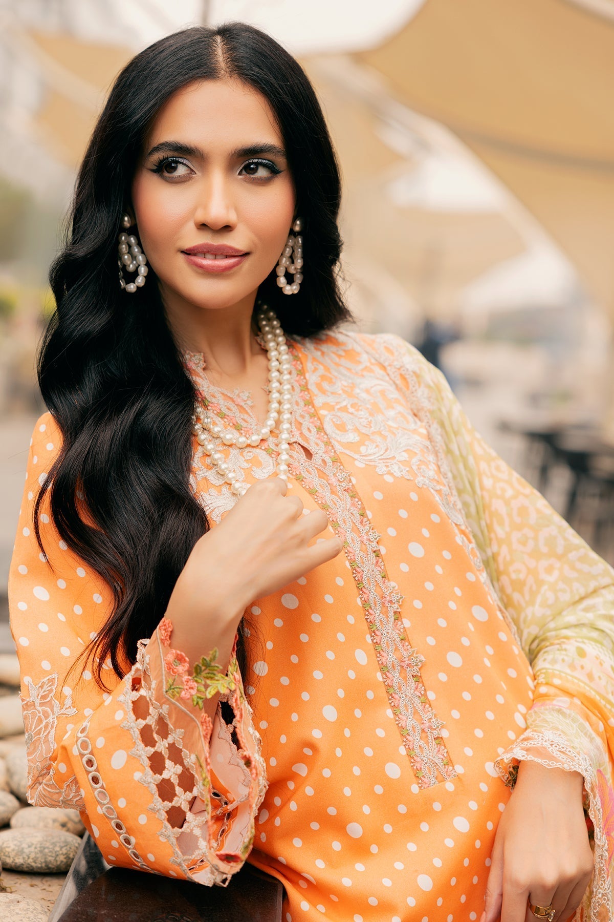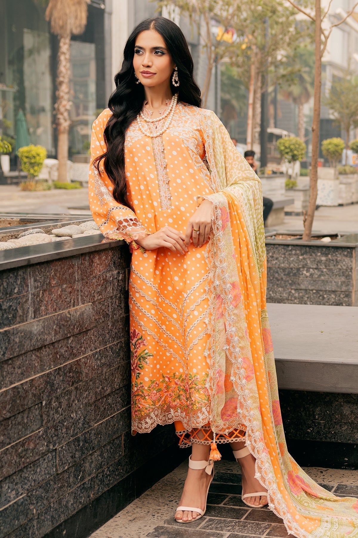 This stunning 3-piece suit from Charizma’s Swiss Miss Voil Collection is crafted from premium Swiss fabric and exquisitely embroidered for a refined festive look. The shirt features an embroidered printed Swiss front (1.25m) paired with a printed Swiss back and sleeves (1.25m). Delicate embroidery includes front and back daman pattis (1m each), a front neck patti (1.25m), sleeves patti (1m) with two elegant sleeve motifs, chok patti (3m), and trouser patti (2m). The outfit is completed with a dyed cotton trouser (2.5m) and a beautifully printed chiffon dupatta (2.5m) adorned with embroidered pallu lace, making it the perfect blend of tradition and modernity.
