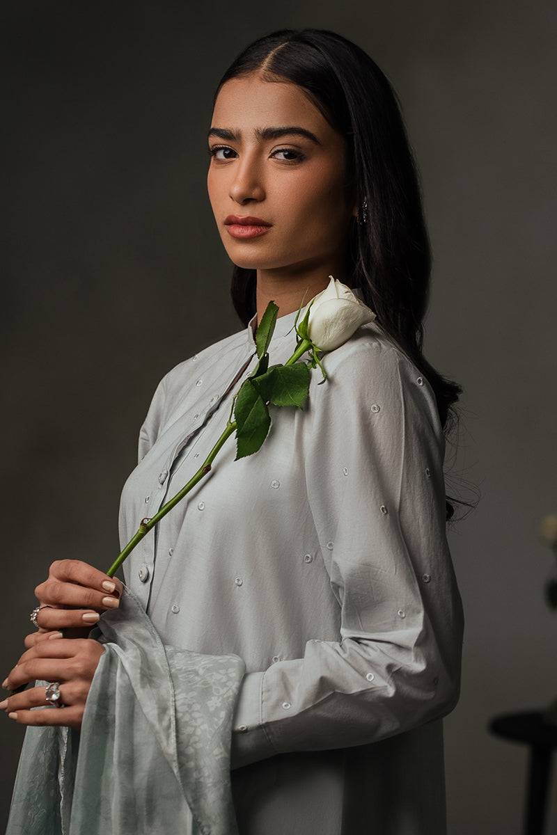 Expertly crafted with a classic A-line style and soft, lightweight lawn fabric, the BLUE HAZE-3PC set is perfect for any occasion. The intricately embroidered front shirt features delicate scalloped edges and a stylish collar with placket. The cuffed sleeves add a touch of elegance, while the medium silk printed dupatta completes the look.