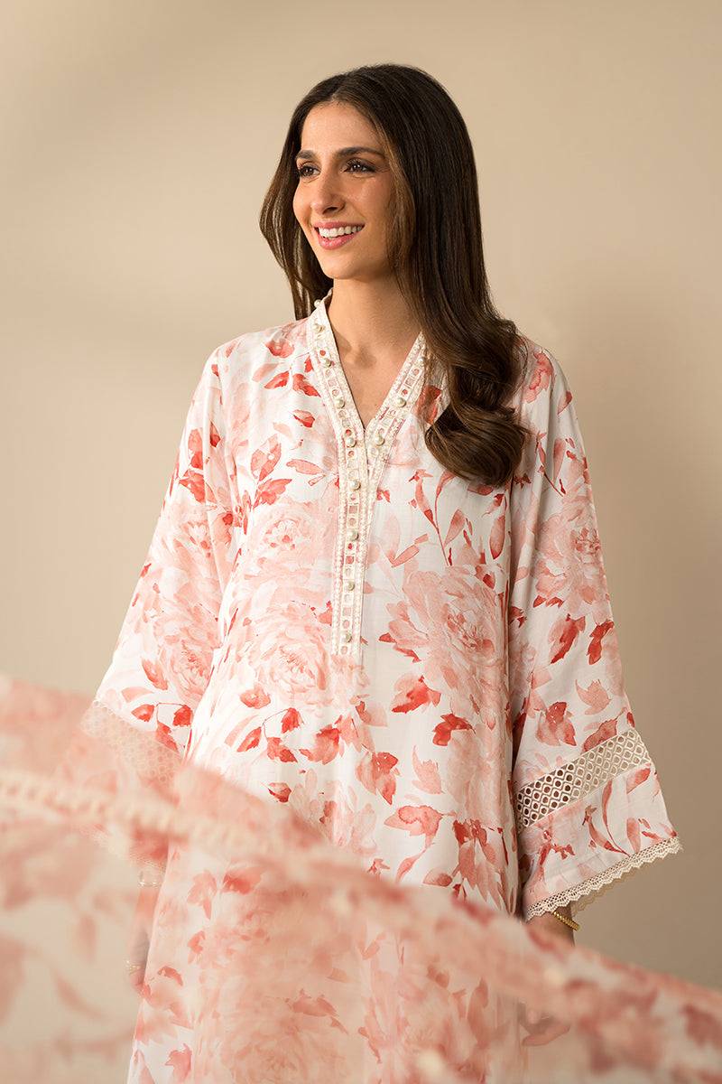 The CORAL IMPRESSION 3PC set features a loose-fitted A-line shirt and organza dupatta, both adorned with beautiful prints and intricate embroidery. Made from luxurious silk fabric, the wrap-around neckline and lace detail add a touch of elegance.