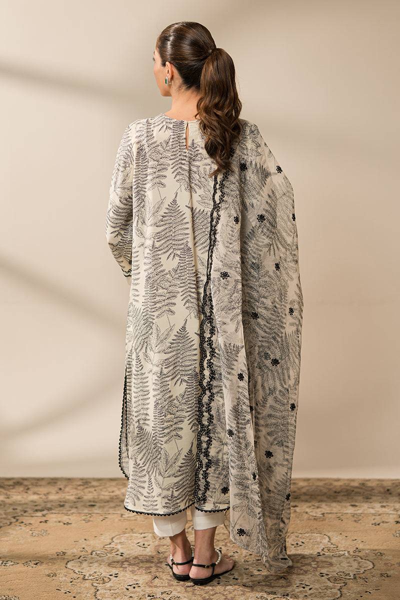 This DUSKY SHRUB 3PC (SHIRT TROUSER DUPATTA) features a silk straight fabric with a printed front and back. The front has a round hem with lace detail, while the back has a slit opening and a lace detail on the hem. The round neckline is embroidered and has tassels, while the sleeves are printed and embroidered. The dupatta is made of organza and features both prints and embroidery.
