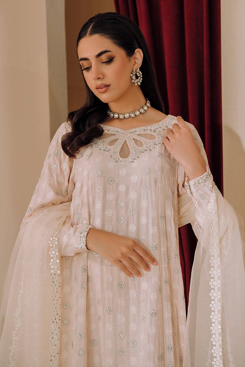 PEACH GLORY is the perfect combination of style and sophistication. Crafted from raw silk, the A-Line flare features intricate sequin embroidery on the front and plain dyed back. The neckline is adorned with sequins, while the sleeves feature organza embroidered detailing. The set is finished with an embroidered dupatta And Trouser.