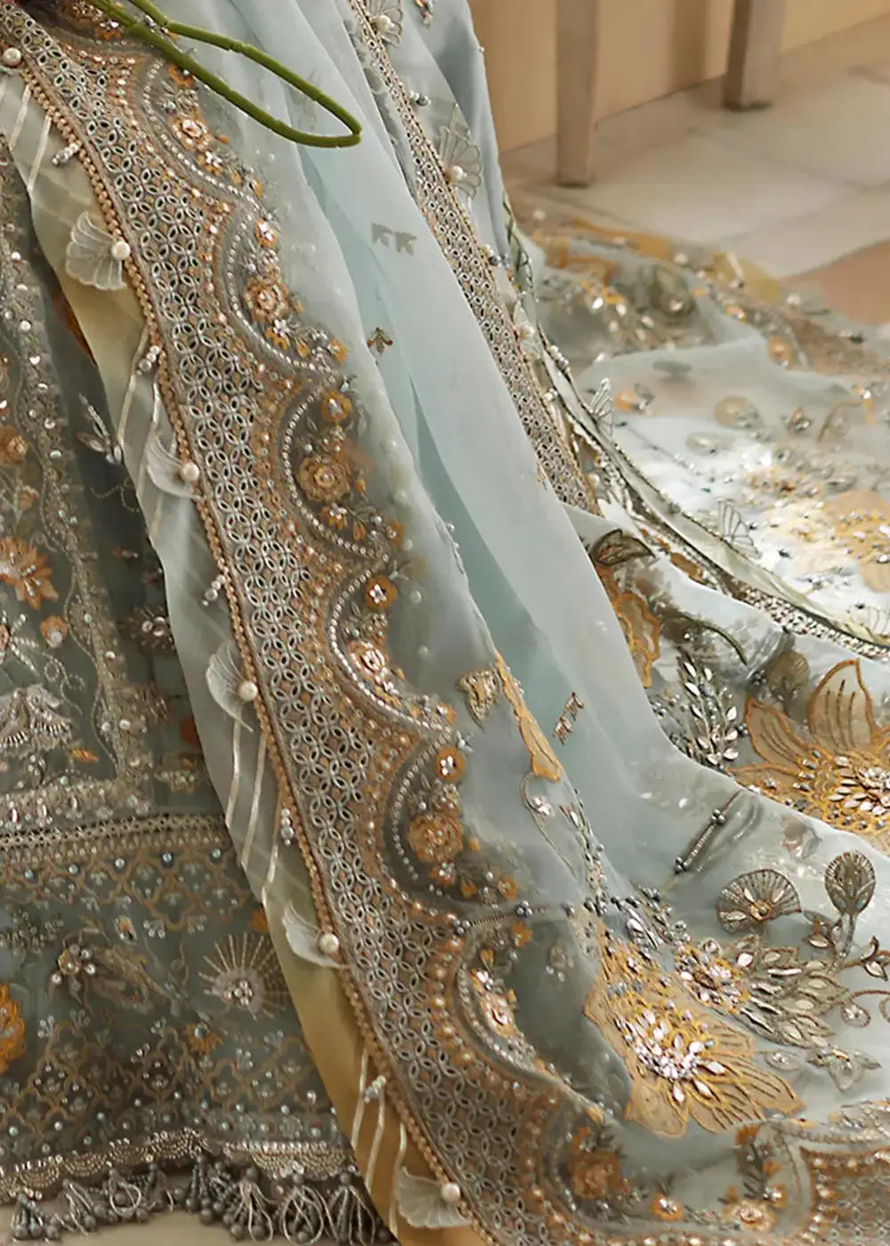 Get ready to shine in 'Esme', an ethereal ELAN creation from the Wedding Festive 23 Collection. Ice blue organza is adorned with canary florals and hand-applied iridescent details, enhanced with sequins, crystals, and seed pearls. The design features tinsel cutwork lattice and silken blooms for a mesmerising effect. The organza dupatta showcases intricately embroidered festoons within gilded schiffly scallops and beautifully tapestried pallus. Paired with a net sharara and raw silk slip, this ensemble is perfect for creating an unforgettable, elegant statement at weddings and festive occasions.