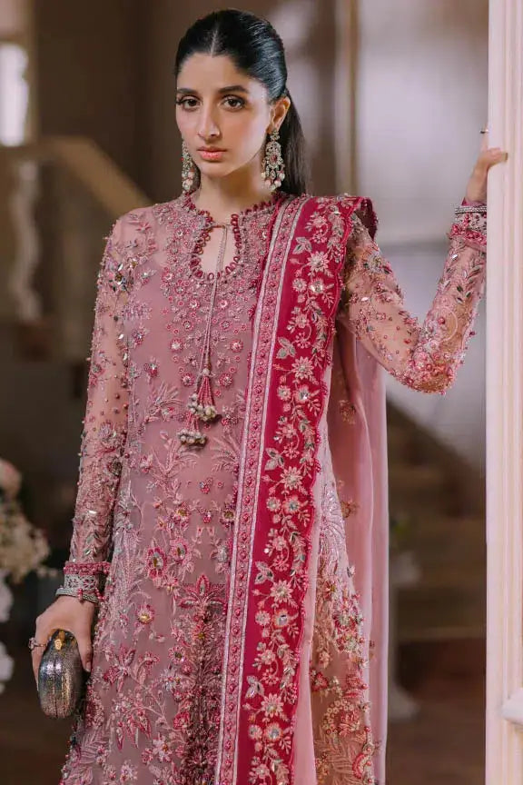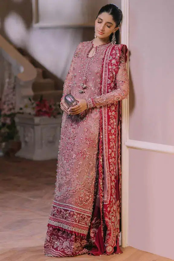 Step into the spotlight with this ELAN ice blue ensemble, featuring an organza front center panel with embellished and embroidered left and right panels. The outfit includes embroidered back panels, elegantly crafted sleeves, and multiple hem and border details. A beautifully embroidered organza dupatta with both 2-side and 4-side patti detailing enhances the luxurious design, while a dyed raw silk slip and trouser complete this statement-making festive outfit.