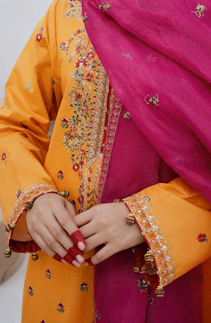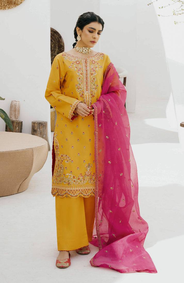 Radiating festive charm, this mustard yellow ensemble is crafted from premium lawn fabric, adorned with elegant embroidery on the shirt for a refined look. It is paired with a dyed cambric trouser for comfort and a beautifully woven jacquard dupatta that enhances the regal appeal. An ideal choice for family gatherings, festive events, or celebratory evenings.