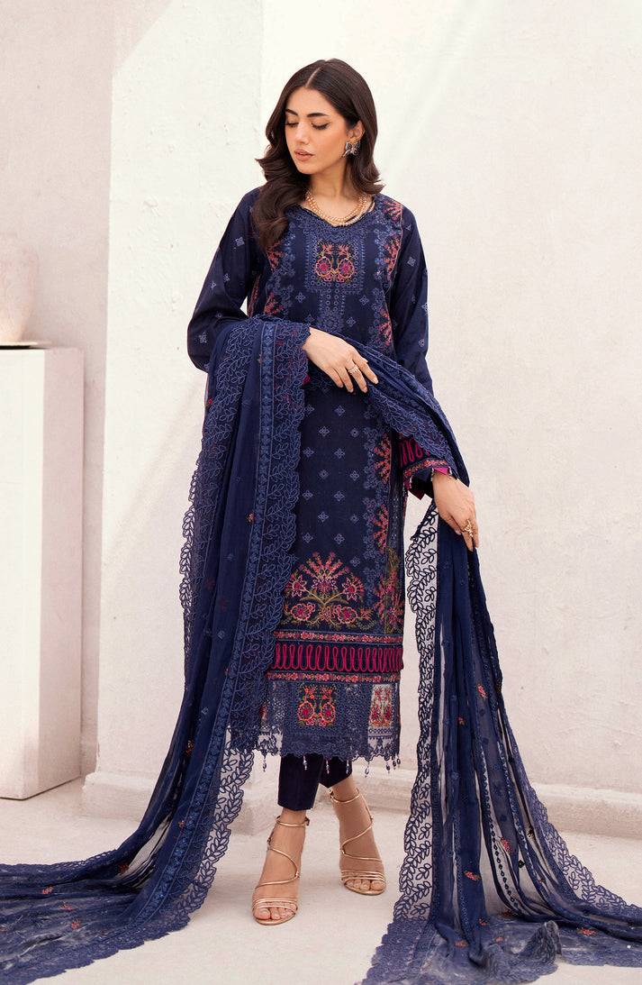 This refined blue outfit embodies luxury and grace with its beautifully embroidered lawn shirt. The ensemble features embroidered front panels, side panels, and sleeves, paired with a plain lawn back for balance. Enhanced with exquisite organza embroidered borders and chalk lace detailing, the design exudes elegance and sophistication. The chiffon dupatta, framed with delicate organza embroidery, complements the look perfectly, while the cambric trouser provides a polished finish. A timeless choice for festive occasions and formal gatherings.