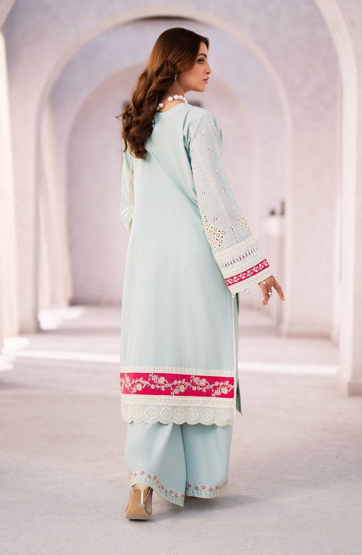Experience graceful sophistication with this Emaan Adeel light ice blue ensemble from the Melisa Luxury Formals collection. The lawn shirt is beautifully crafted with embroidered front panels and sleeves, enhanced with organza borders for an elevated look. A luxurious jacquard dupatta is further adorned with embroidered borders and palloo details, making it a statement piece. Paired with a cambric trouser finished with an embroidered lace, this outfit is the perfect blend of traditional elegance and contemporary style for festive occasions.