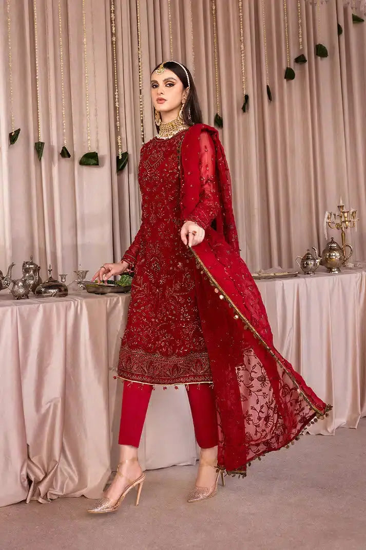 This refined ensemble from Romansiyyah Luxury Formals 23 is designed for timeless elegance. The chiffon shirt is delicately handcrafted with embroidered details on the front, sleeves, and back. Paired with a matching chiffon embroidered dupatta and enhanced with organza borders for both the shirt and sleeves, this outfit radiates sophistication. A dyed raw silk trouser completes the graceful look, making it ideal for weddings and luxury occasions.