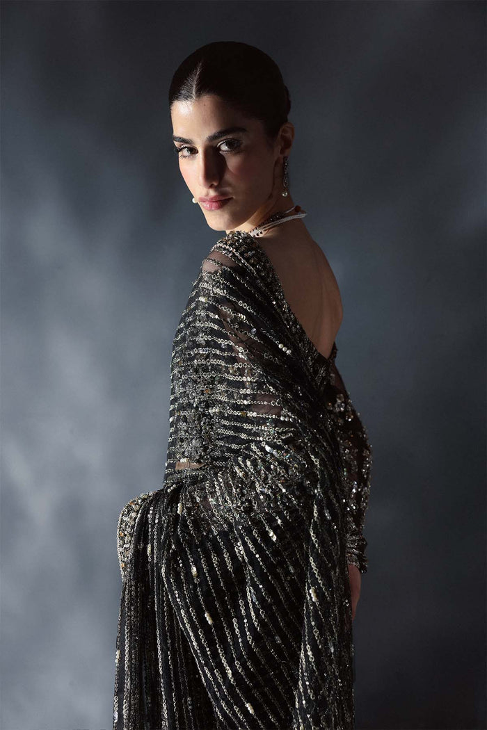 Step into a realm of timeless allure with this stunning black saree ensemble, designed for those who command attention with elegance and grace. The saree, crafted from luxurious black net fabric, drapes effortlessly, offering a captivating interplay of sheer sophistication and dramatic allure. Its delicate texture adds a modern twist to the classic silhouette, creating an air of understated glamour. Paired with the saree is a heavily embellished blouse, also fashioned from net fabric. Intricate handwork, shimmering sequins, and dazzling embellishments adorn the blouse, creating a striking contrast against the black backdrop. Its design ensures a perfect blend of tradition and contemporary opulence, making it the star of the ensemble.