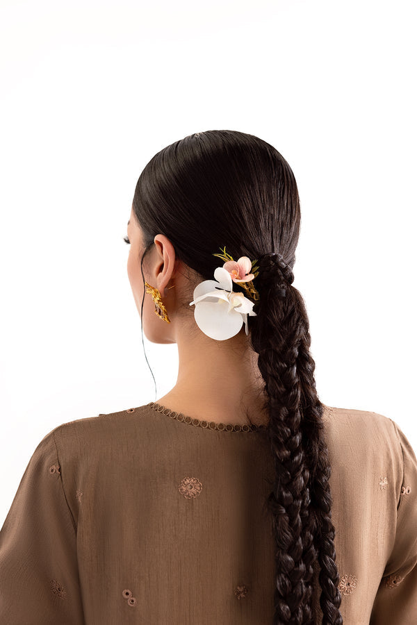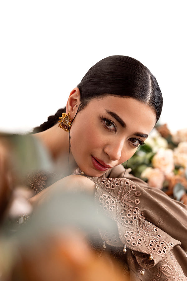 Embody elegance in this luxurious brown ensemble crafted from premium Korean raw silk. The long shirt features detailed loops and stitching along the panels, paired with delicate embroidery for a timeless, textured look. Matching culottes with an embroidered border offer a flattering, seamless flow. A sheer organza dupatta, adorned with intricate embroidery, completes the outfit with a graceful contrast, perfect for refined occasions.