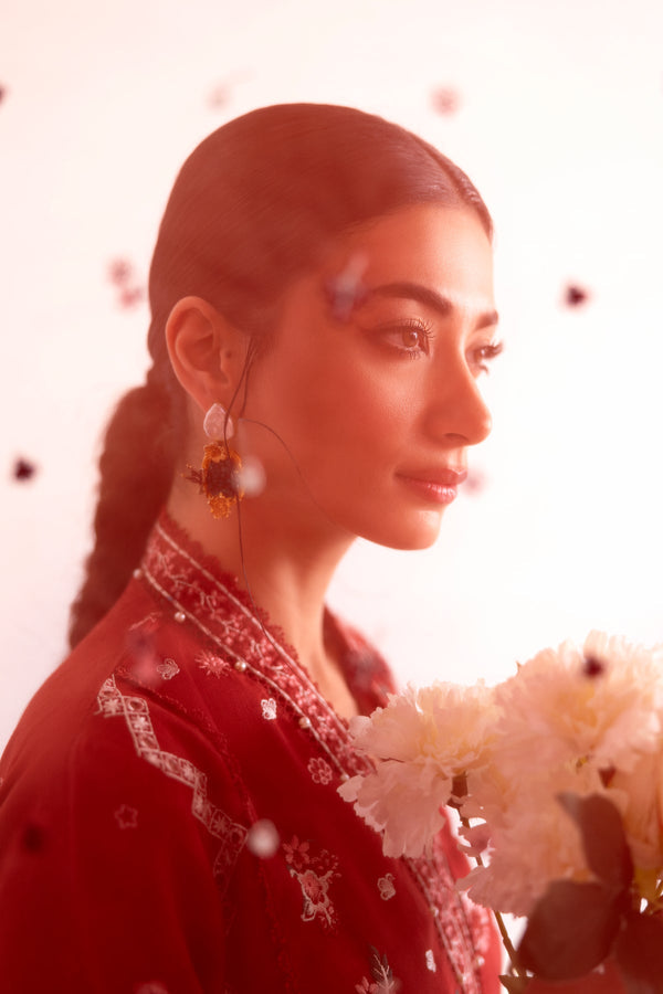 Add vibrant elegance to your wardrobe with this stunning deep rust long shirt, featuring bold multi-color embroidery that blends geometric side panels with delicate floral mid-panel designs. The overlap neckline enhances its modern silhouette with a sophisticated touch. Paired with tailored culottes showcasing side cut details and subtle lace accents, the outfit combines style and comfort. A beautifully embroidered organza dupatta completes the look, adding grace and harmony to this striking ensemble.