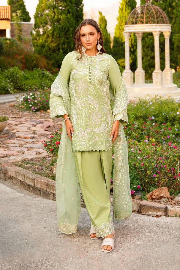 Step into timeless elegance with our Pistachio Ensemble, a perfect blend of heritage and sophistication. Crafted from premium Korean raw silk, the short shirt is adorned with intricate embroidery, exuding artisanal charm. Paired with a classic broad shalwar, this ensemble pays age to old-school glamour while maintaining a refined contemporary appeal. Completing the look is a delicately embroidered organza dupatta, adding a sheer touch of grace.