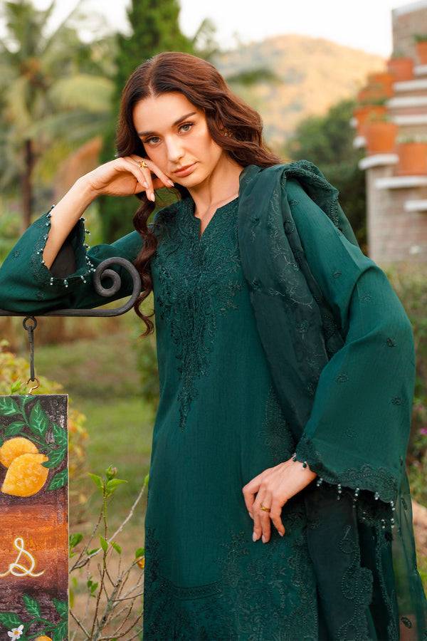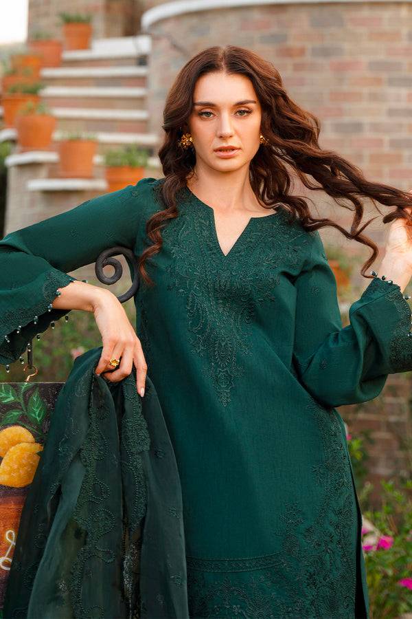 Elevate your ethnic wardrobe with our Bottle Green Shalwar Kameez, a masterpiece crafted in exquisite Korean raw silk. The rich, deep green hue serves as the perfect canvas for the intricate embroidery that adorns every inch, showcasing artisanal craftsmanship at its finest. Complementing this luxurious ensemble is an embroidered Organza Dupatta, featuring delicate patterns that enhance the overall elegance and sophistication.