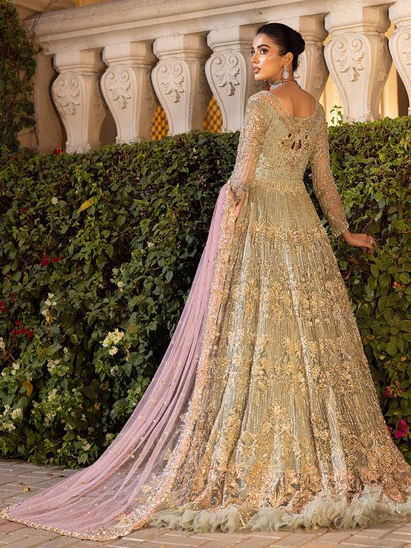 Meticulously crafted attire accompanied by rich festive shades of Pistachio green enhanced with spray of sitara, white pearls, nakshi, sequins, shimmer pani and meticulously rendered embroideries, this ensemble is sure to enchant the senses.