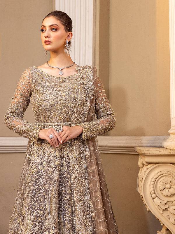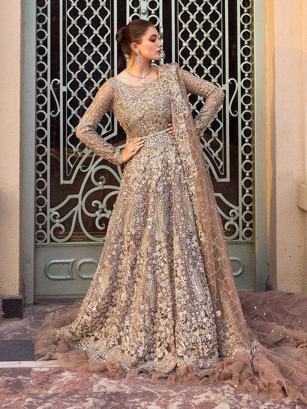 The beautifully designed ensemble while exhibiting timeless beauty will float your way through this wedding season giving finishing touches by adding katori sequins, peach crystals, floral sequins, beads and other embellishments. The ensemble is complemented with a net tail and dupatta, this design creates a bold composition that is not for a faint heart.