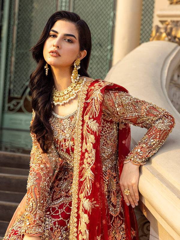 Preserve an everlasting charm in this exceptionally spectacular dress featuring delicate stonework, fine detailing, and a palette of classic hues. The net gown is fully embellished with GOTTA ,DABKA, NAKSHI, PEARLS, PIPES, SHIMMER PANNI BATKI, SEQUINS adding richness to the traditional silhouette giving it a glamourous vibe