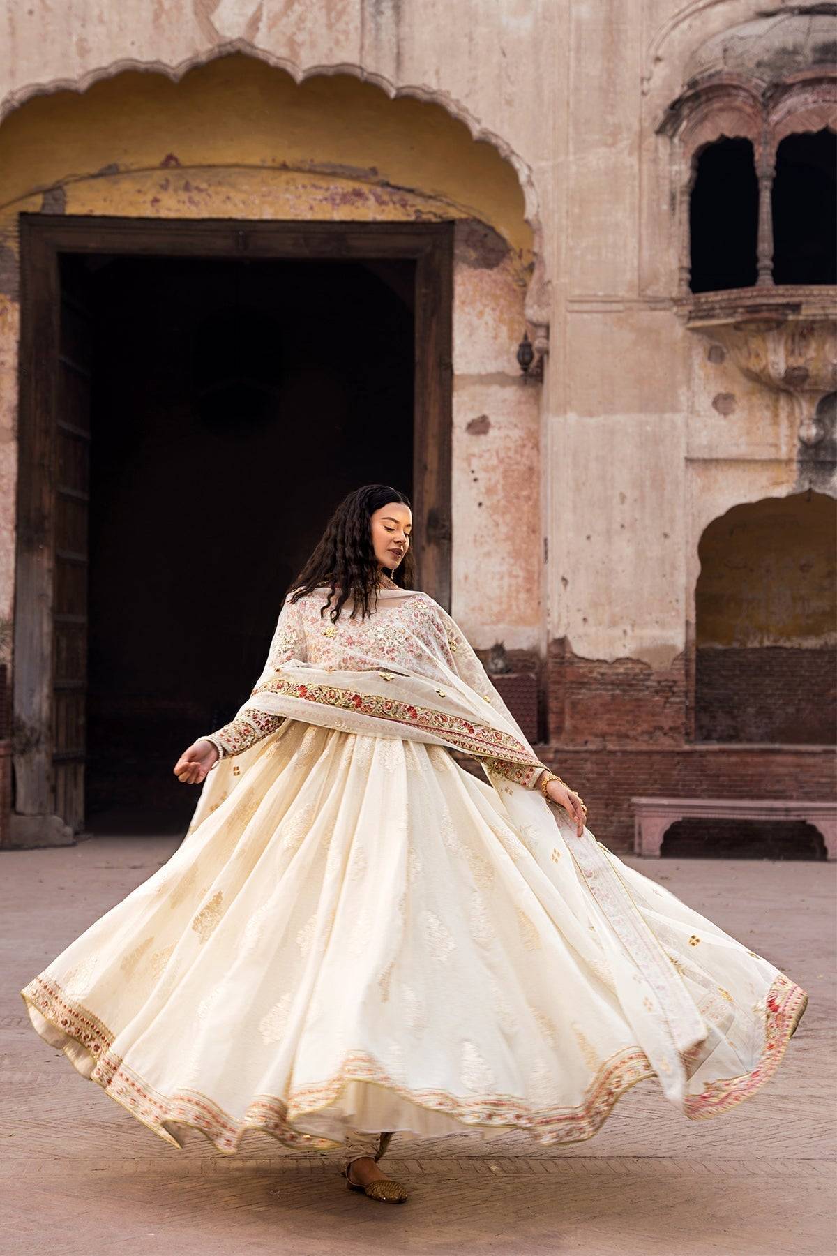 In a lovely shade of off white, this traditional kalidaar peshwas is adorned with delicately embroidered self-dori motifs embellished with sequins. The multi-colored body and sleeves add a touch of charm, creating a splendid and harmonious look. Paired with a gracefully dramatic dupatta featuring colorful borders on all four sides, this set truly embodies timeless elegance. The ensemble is completed with a churidar pajama, giving it a classic and traditional allure that exudes grace and sophistication.