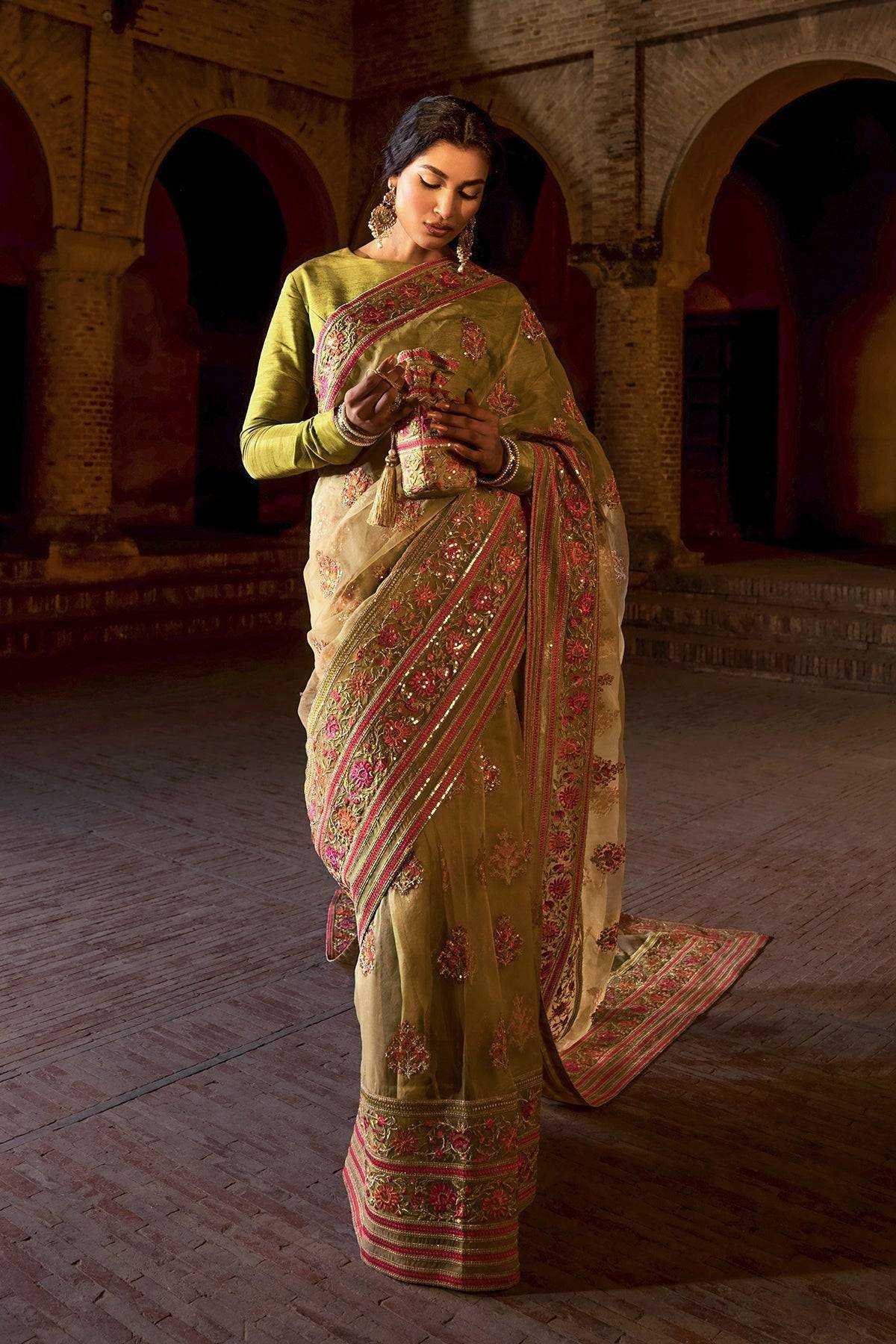 This rich organza saree draws its lively color palette from the essence of cultural diversity and sophistication. The blouse, crafted from luxurious olive-green raw silk, features a refined crew neckline and flowing full sleeves, exuding timeless grace. Meanwhile, the draped organza fabric enchants with intricate chatta embellishments and breathtaking borders that gracefully adorn both sides of the fabric lengthwise, culminating in a striking heavy border at the hem. Complementing the ensemble, the petticoat, fashioned from raw silk, adds a touch of opulent comfort.