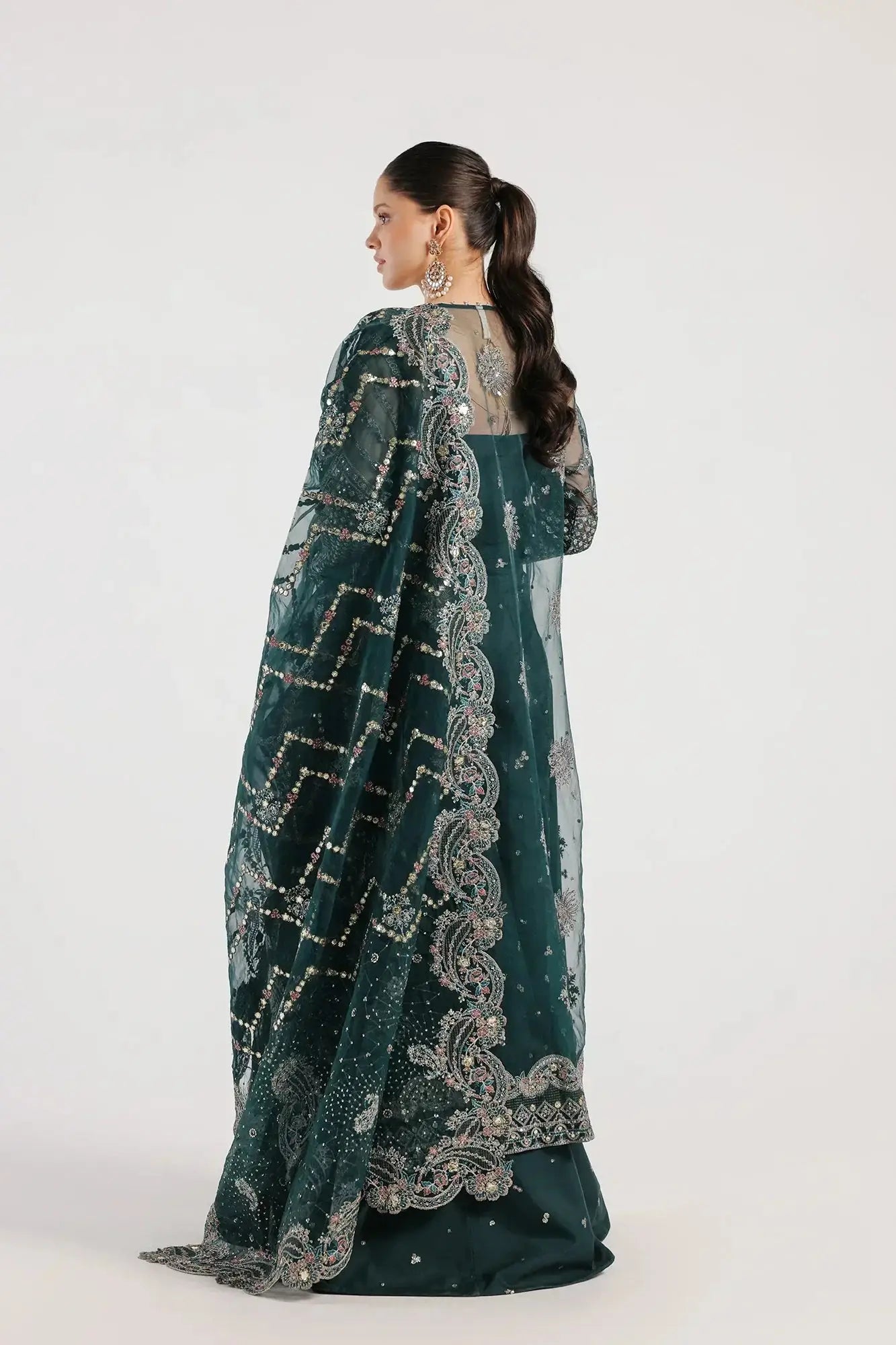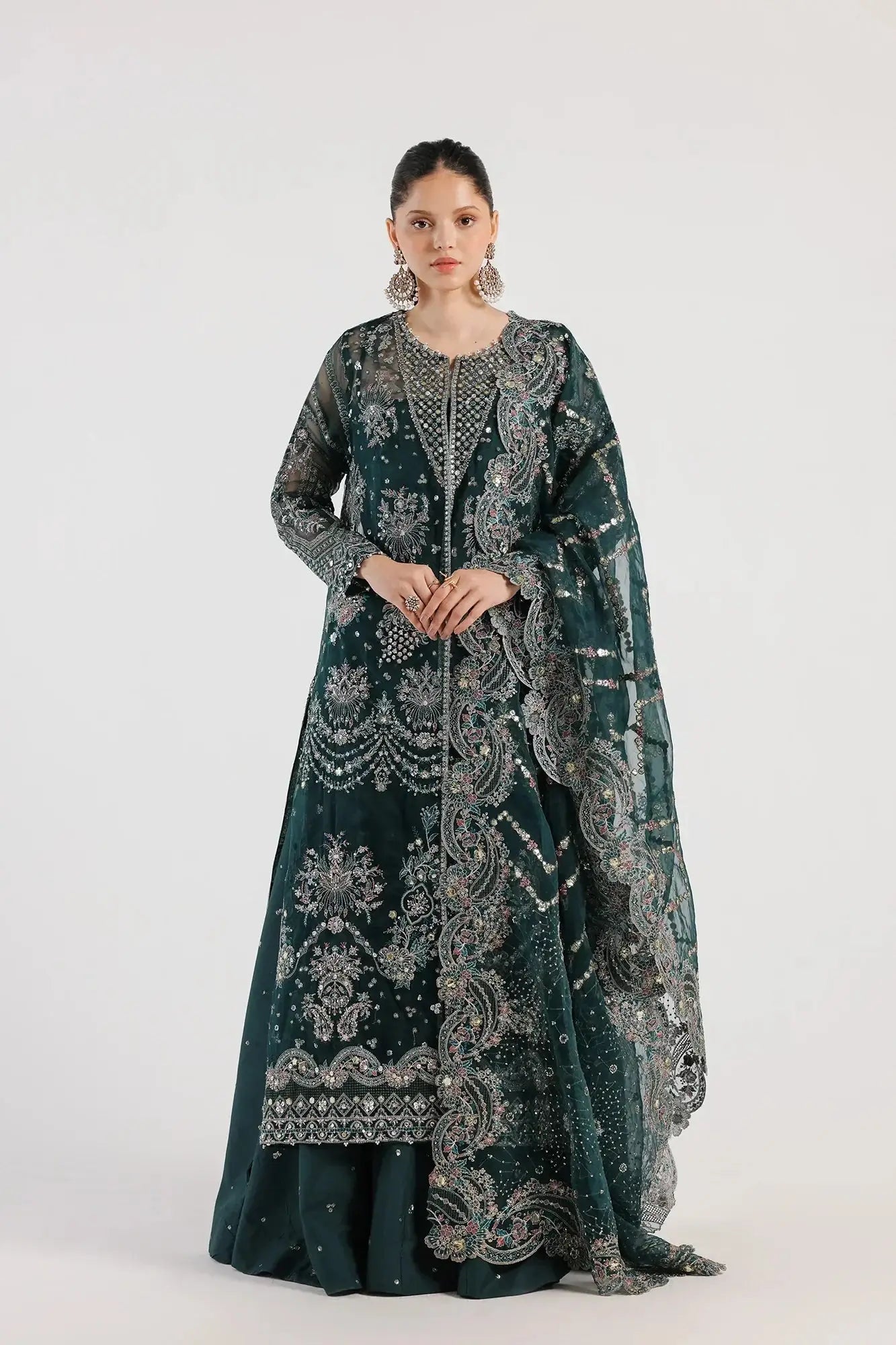 Introducing the epitome of grace and elegance, an elegant ensemble features an appealing teal shade aesthetically rich shirt enriched with captivating floral embroidery all over with mesmerizing designs and scintillating details. Paired with an inner slip and a classy flared sharara adorned with dazzling embroidery, the enchanting look is complimented with a classically draped dupatta with shimmering designs. This statement ensemble is perfect for festive and happening events.