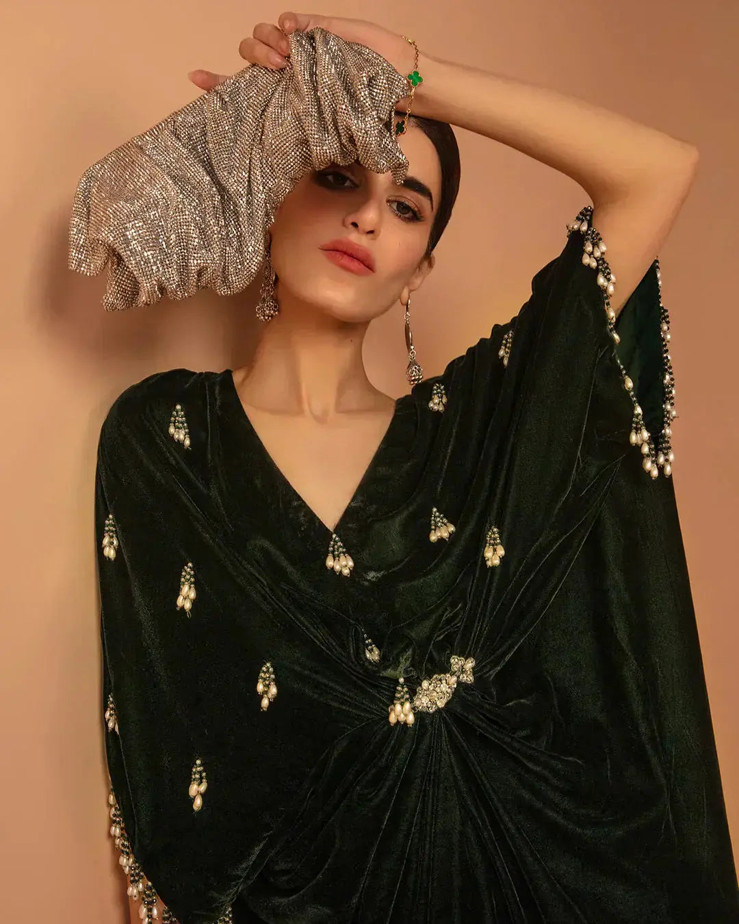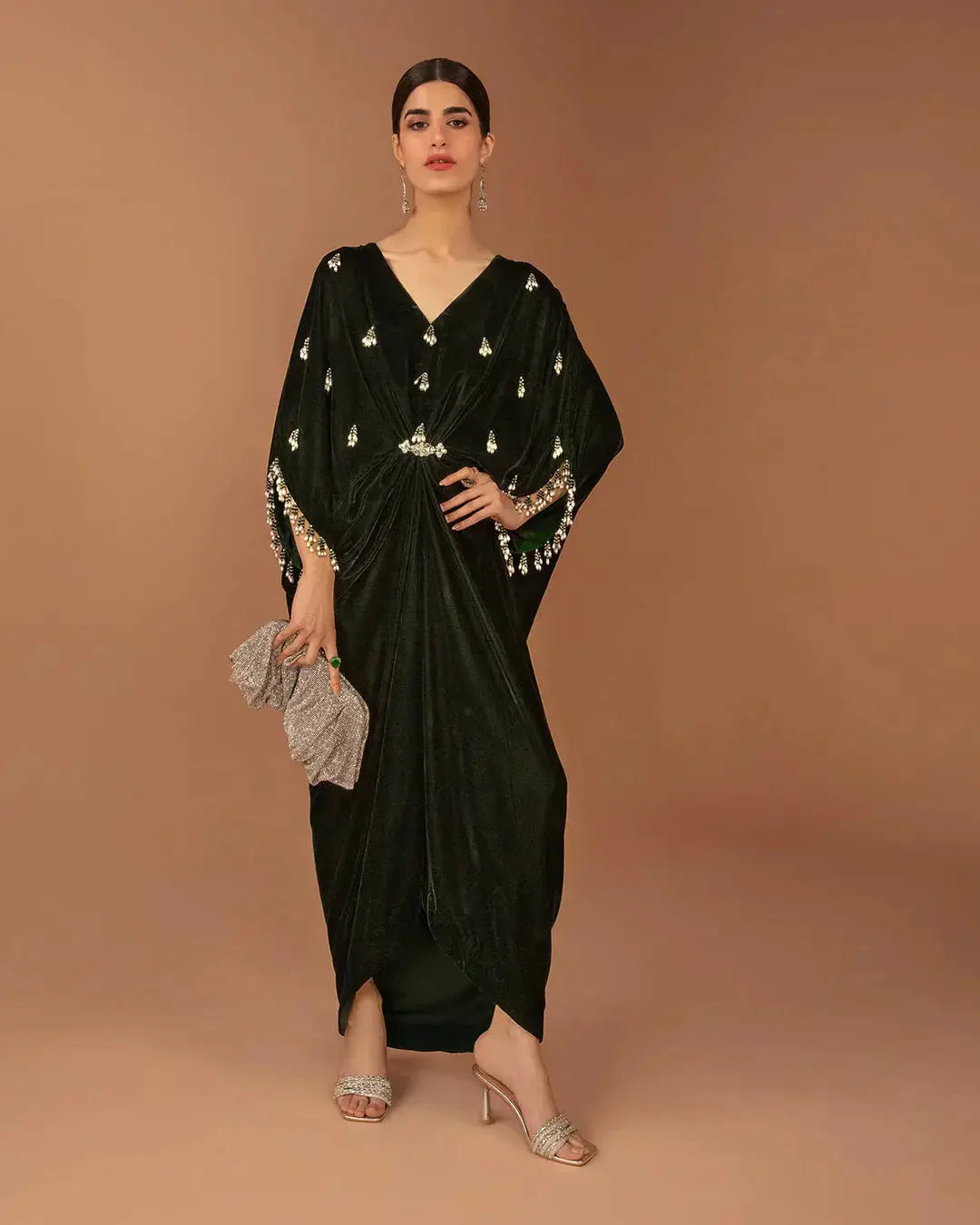 Borrowing inspiration from a starry nightscape, Perin is the pinnacle of modern glamour. The bottle green velvet kaftan is meticulously embellished with a delicate scatter of sequins and pearls, crafted in true FS aesthetic to radiate sublime elegance. Paired with a velvet trouser, this ensemble captures timeless sophistication with contemporary charm.