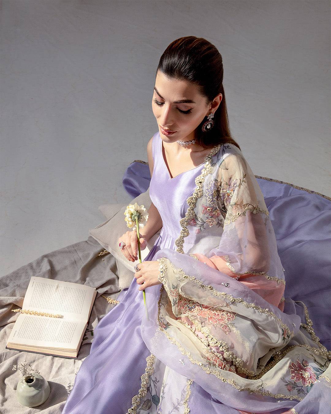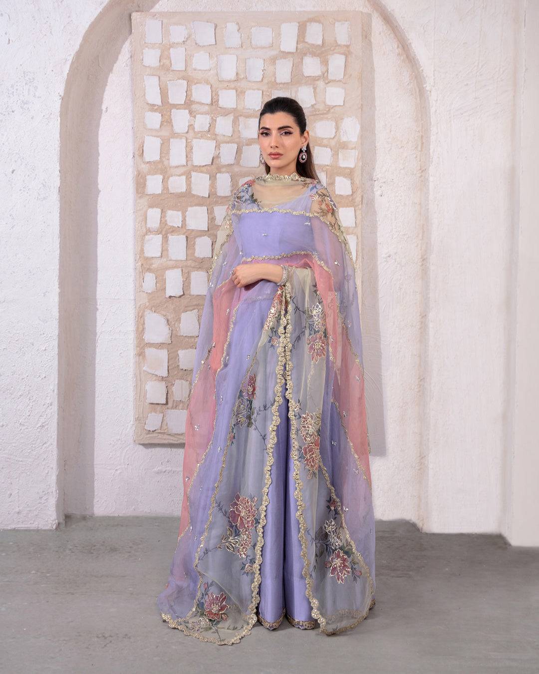 A vision of grace, this lilac silk pishwas from Faiza Saqlain’s Zurina Luxury Pret collection is a timeless festive ensemble. The flowing embroidered silk pishwas pairs beautifully with a classic silk churidaar, while the organza dupatta—printed, embroidered, and delicately embellished—adds an enchanting finish. Perfect for weddings, receptions, and formal soirées.