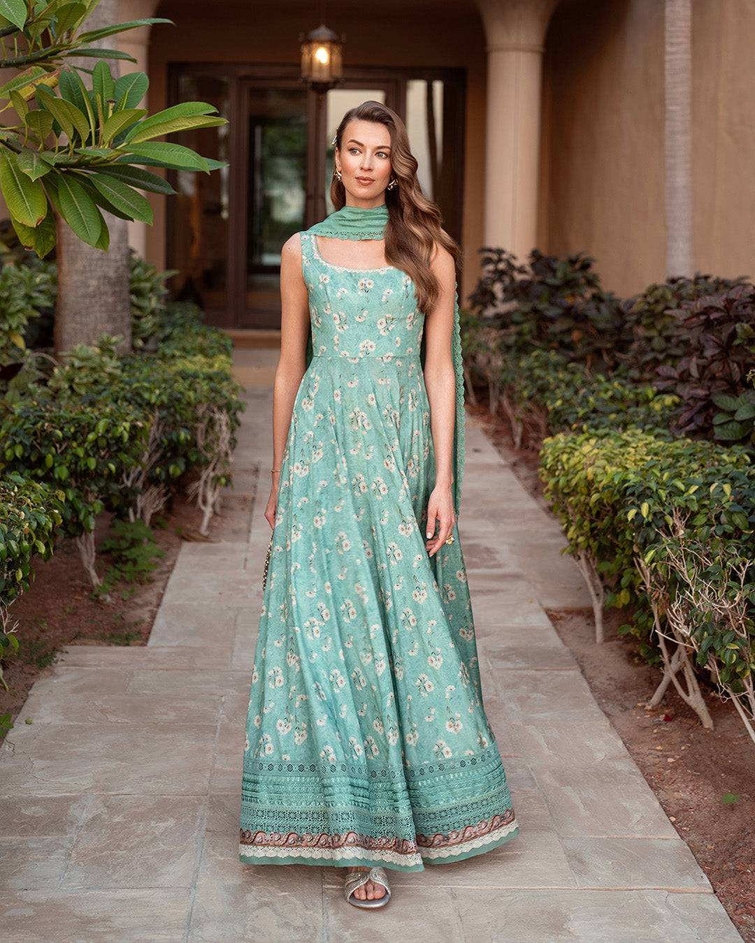 Step into refined sophistication with this turquoise silk pishwas from Faiza Saqlain Zurina Luxury Pret collection. The ensemble features a beautifully printed and delicately embroidered silk pishwas, paired with a classic silk churidaar and a matching silk dupatta. Perfect for festive gatherings and formal occasions, this outfit radiates elegance while maintaining effortless comfort.
