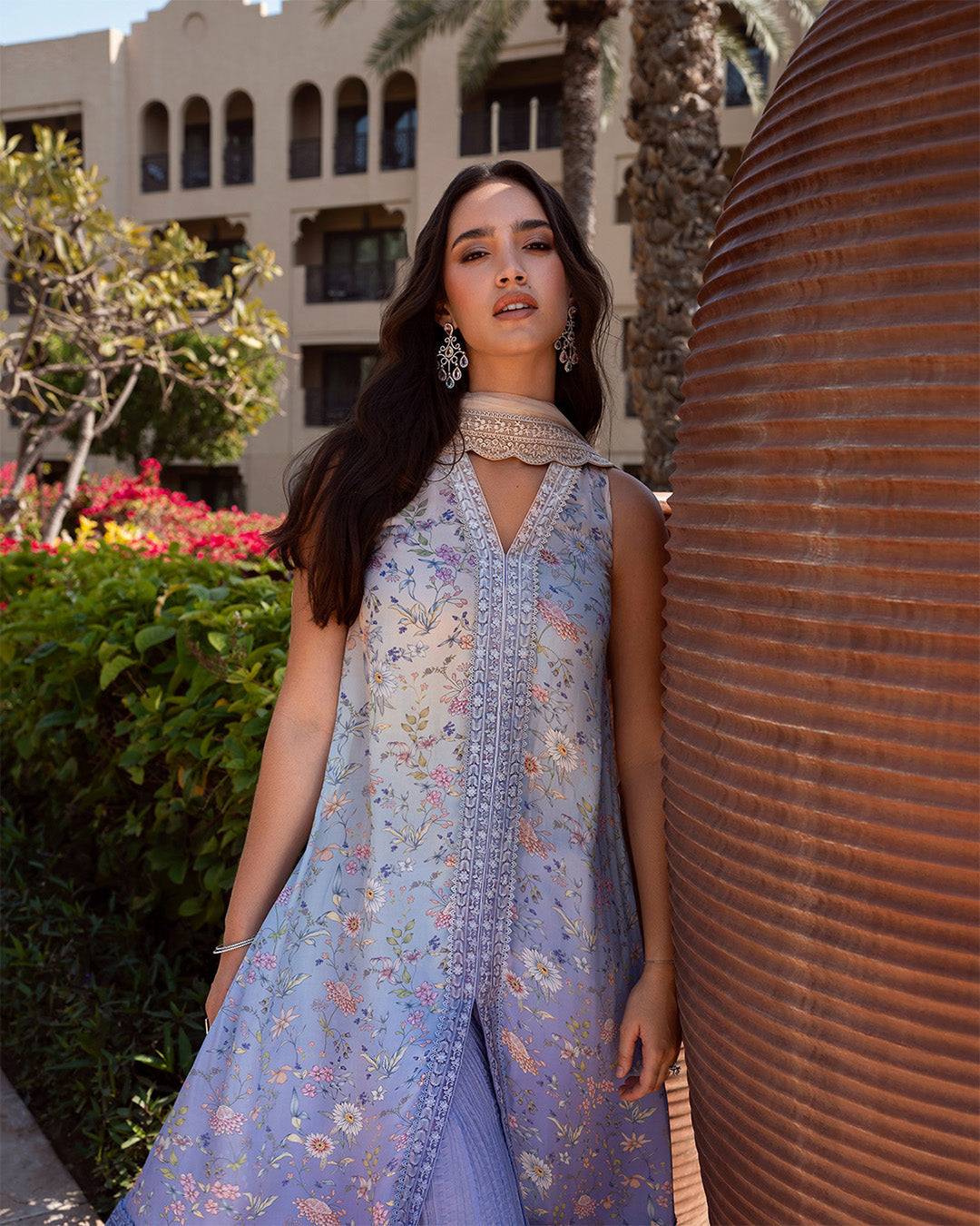Step into graceful sophistication with this Faiza Saqlain Zurina Luxury Pret ensemble. The lilac silk shirt, beautifully printed and embroidered, exudes elegance with its refined detailing. Paired with a flowing crushed silk sharara that adds volume and charm, and an embroidered chiffon dupatta for a delicate finish, this outfit is perfect for festive gatherings and formal occasions.