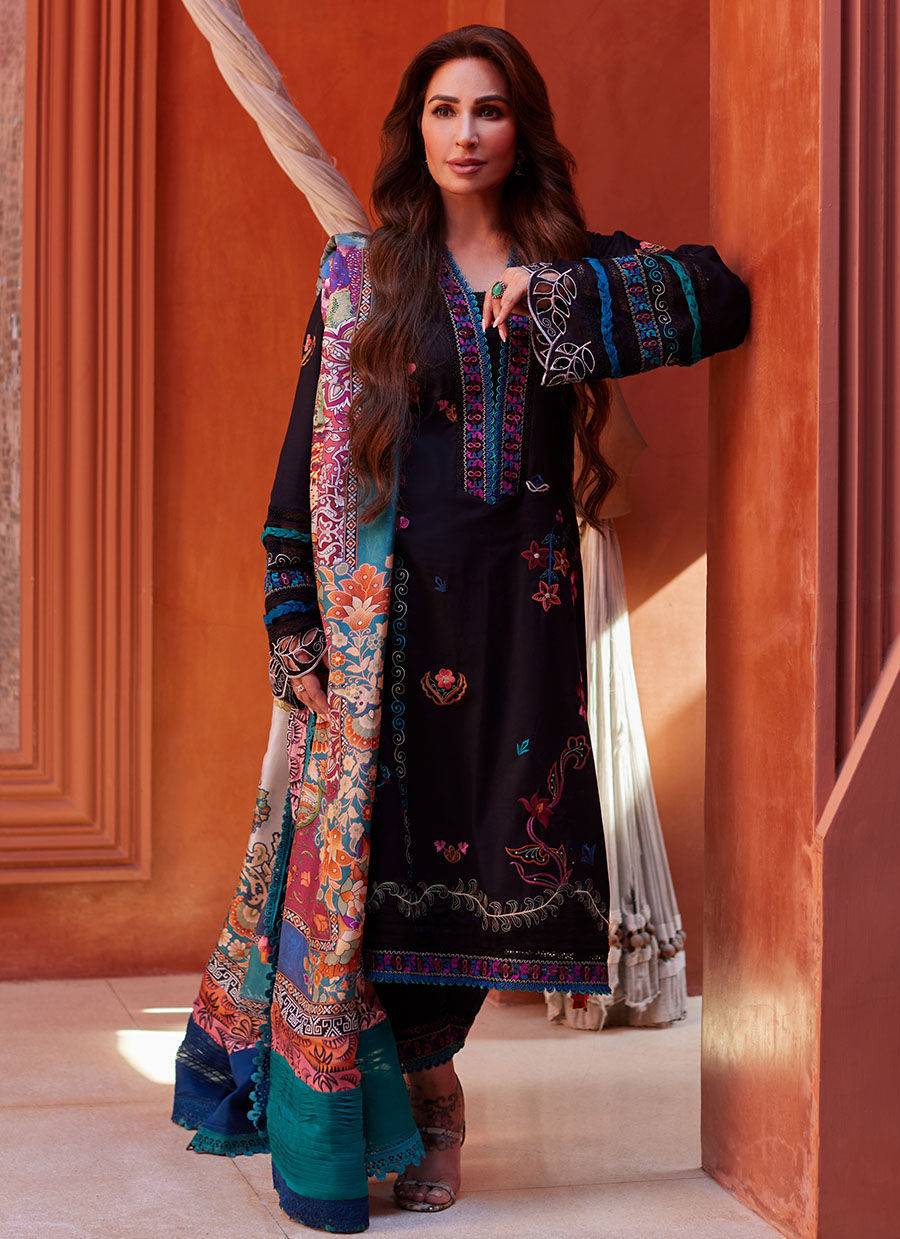 Elevate your spring wardrobe with this Black ensemble from Farah Talib Aziz’s Suay Lawn 24 Collection. The lawn shirt features intricately embroidered composed front, back, and sleeves, accented with organza and schiffli borders for a striking visual appeal. Paired with jacquard pants and a printed silk dupatta, this outfit combines traditional embroidery with modern elegance, making it perfect for festive gatherings and seasonal celebrations.
