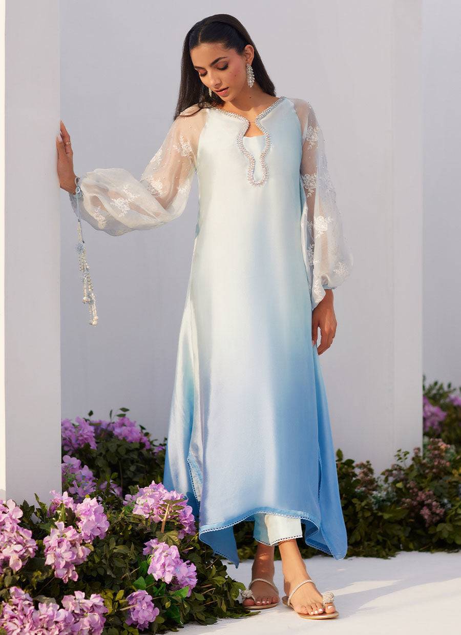 Farah Talib Aziz | Zaza Luxe Pret 24 | BOW OMBRE BLUE EMBELLISHED KAFTAN CUT SHIRT