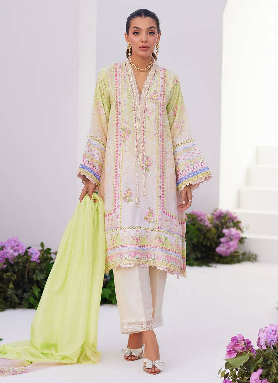 Infused with the signature FTA aesthetic, this ensemble features the perfect pastel hues to make your wardrobe shine. The raw silk shirt is treated with a striking ombre effect, smoothly transitioning from zingy pear green to pale pink, and adorned with delicate whimsical florals. The relaxed, much-loved silhouette features a universally flattering neckline enhanced with hand-made floral motifs, pearls, and sequins for timeless elegance. A pure medium silk dupatta with pink organza pallus and embroidered floral motifs completes the look with graceful flair. Pair it with the embroidered cutwork pants (as shown) for a chic, polished outfit.