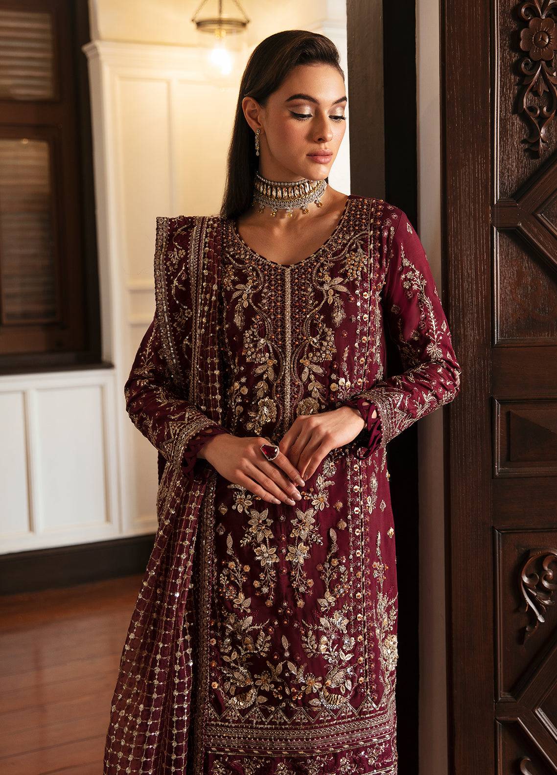 Unveil timeless charm with this exquisite Burgundy ensemble from Gulaal Luxury Pret collection. The shirt is masterfully crafted on viscose, featuring adda work and delicate sequin embroidery across its center, left, and right side panels. Embroidered sequined sleeves and back add richness, while multiple embroidered borders enhance the shirt’s design with artistic intricacy. The fully embroidered organza dupatta with a sequined four-sided border provides an ethereal finishing touch, balancing the bold tones of the outfit. Paired with a dyed raw silk trouser, this ensemble is the epitome of elegance—perfect for weddings, festive occasions, or high-profile soirées where you want to radiate sophistication.