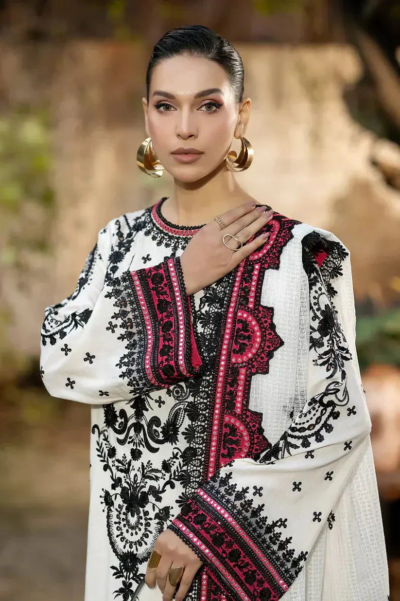 A pristine white ensemble from Imrozia Premium’s Gulposh Luxury Lawn 24 collection. The shirt features an embroidered front, plain back, and detailed sleeves. The dupatta crafted in embroidered jacquard is enhanced with organza and raw silk borders, while the shirt front is highlighted with an embroidered organza motif. Dyed plain cotton trousers complete this elegant, festive-ready outfit.